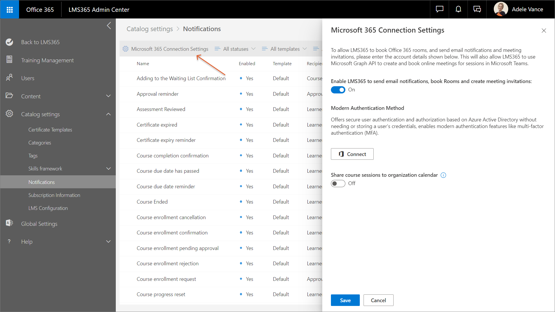 Damit Learn365 Benachrichtigungen versenden und Räume für Kurssitzungen buchen sowie Einladungen für Microsoft Teams-Besprechungen erstellen kann, muss der Katalogadministrator zuerst die Microsoft 365-Verbindungseinstellungen dieses Katalogs im Mandanten konfigurieren.