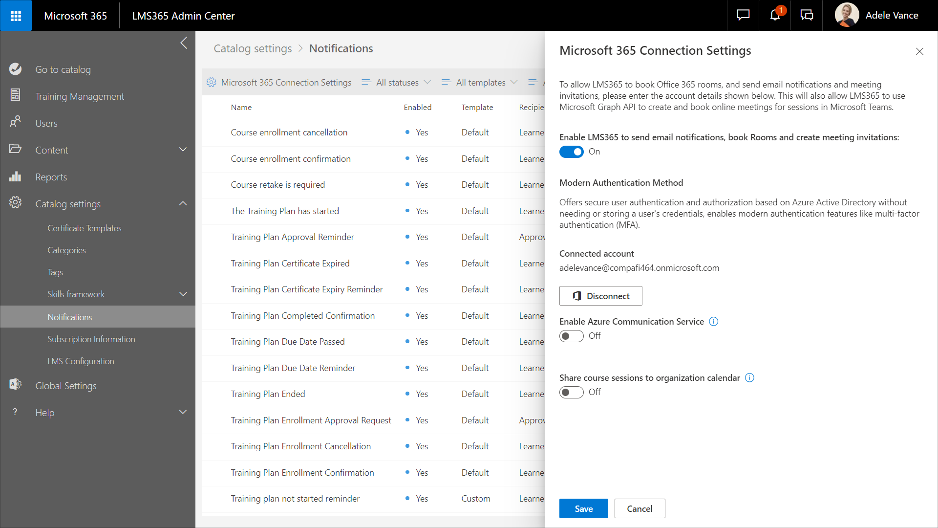 1. Gehen Sie zu Learn365 Admin Center > Katalogeinstellungen > Benachrichtigungen. Die Seite Benachrichtigungen öffnet sich.