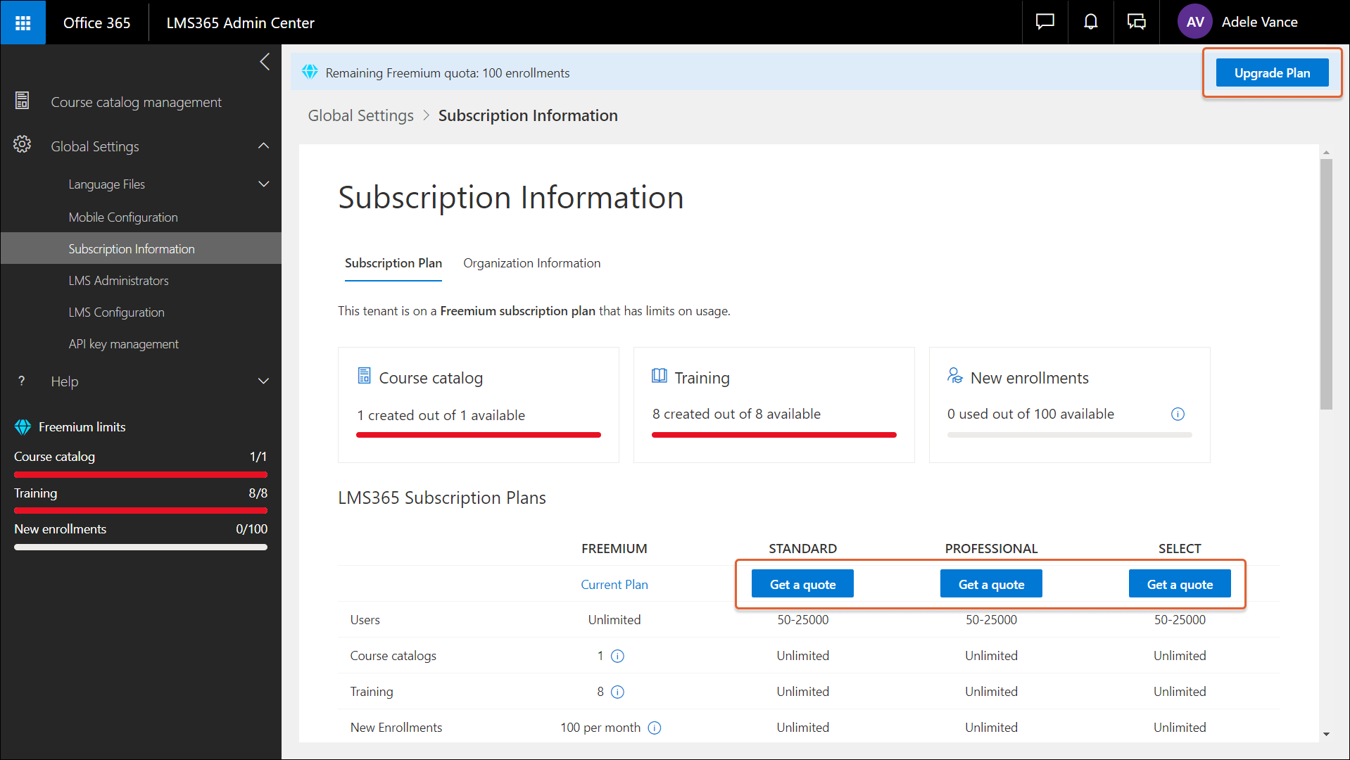 Um ein Upgrade zu bestellen, gehen Sie zu Learn365 Admin Center > Kurskatalogverwaltung, klicken oben rechts auf der Seite auf Tarif-Upgrade und füllen dann das Formular Angebot abrufen aus.
