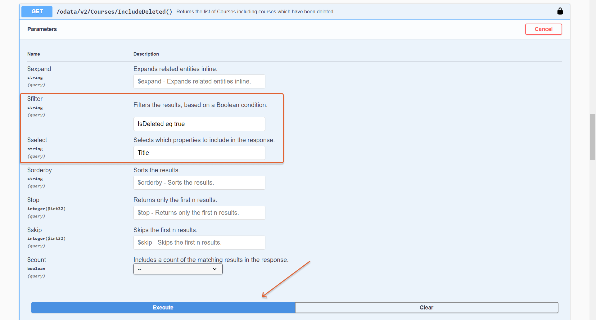 - Fügen Sie IsDeleted eq true in $filter ein.