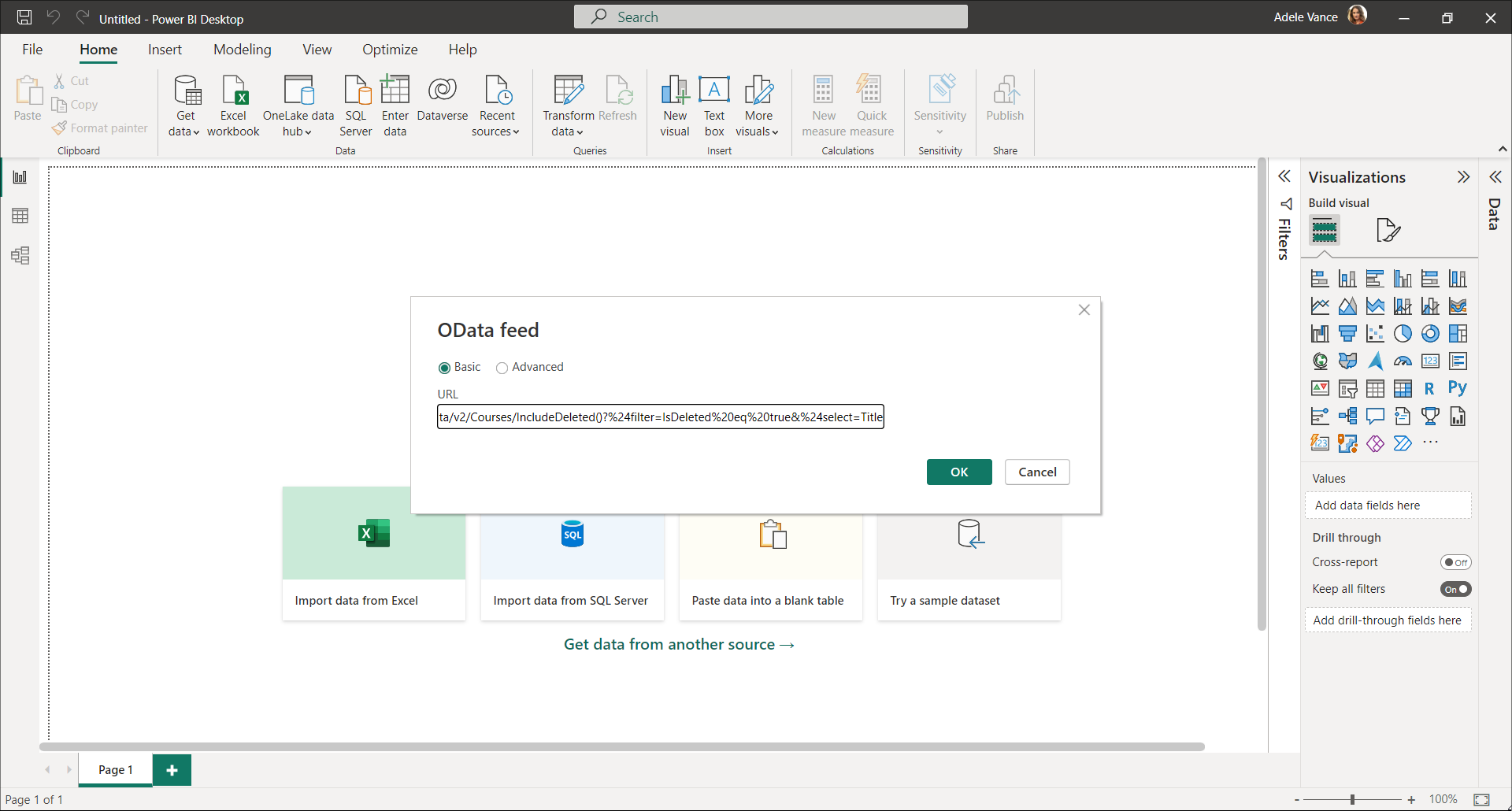 6. In Power BI Desktop wählen Sie Daten abrufen > OData-Feed aus, fügen die kopierte URL in das Feld URL ein und klicken auf OK > Laden.