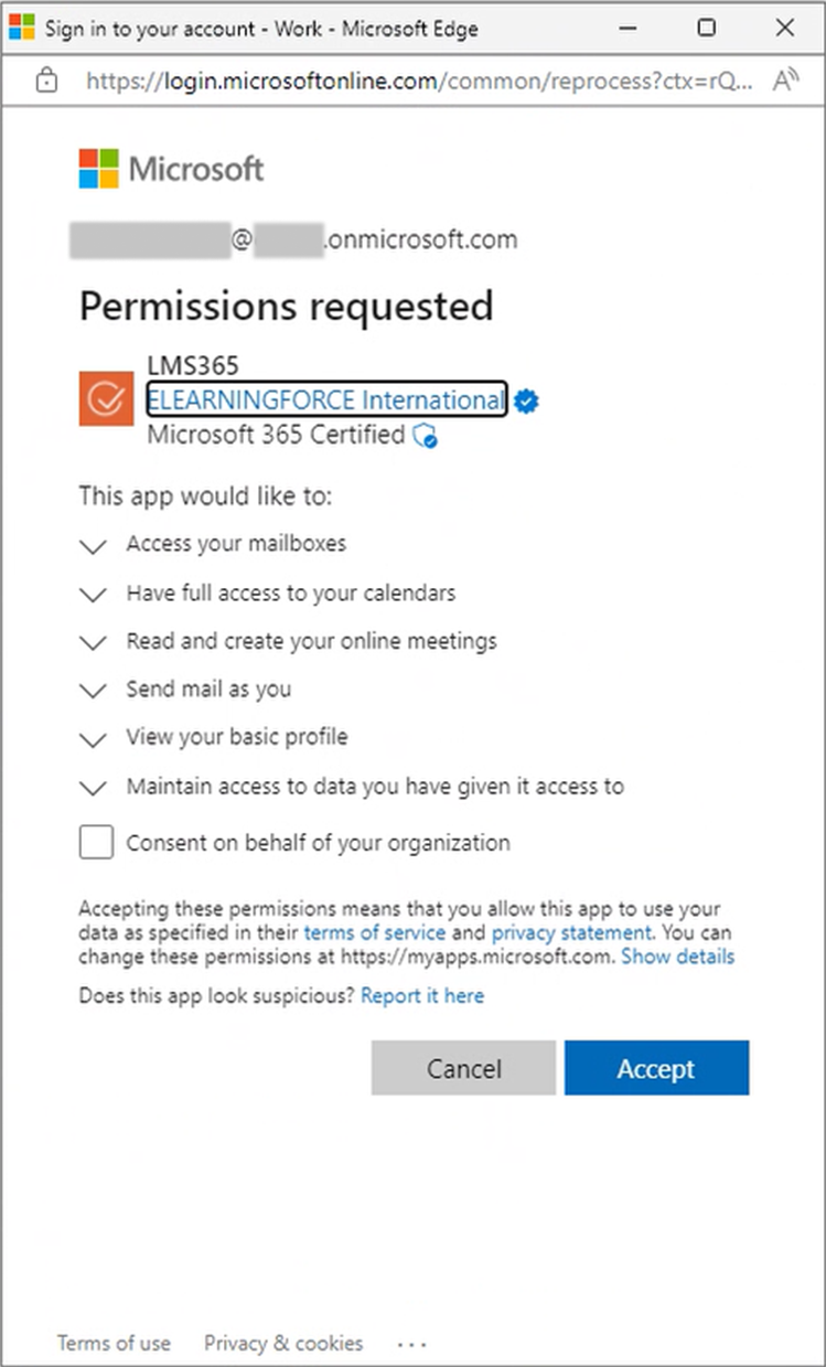 Das Aktivieren des Kontrollkästchens Zustimmung im Namen Ihrer Organisation hat zur Folge, dass die Einwilligung nicht erneut eingeholt werden muss, wenn ein anderes Konto in Ihrer Organisation mit Learn365 verbunden wird. Damit Sie jedem verbundenen Konto einzeln die Einwilligung gestatten können, raten wir davon ab, diese Option zu aktivieren.