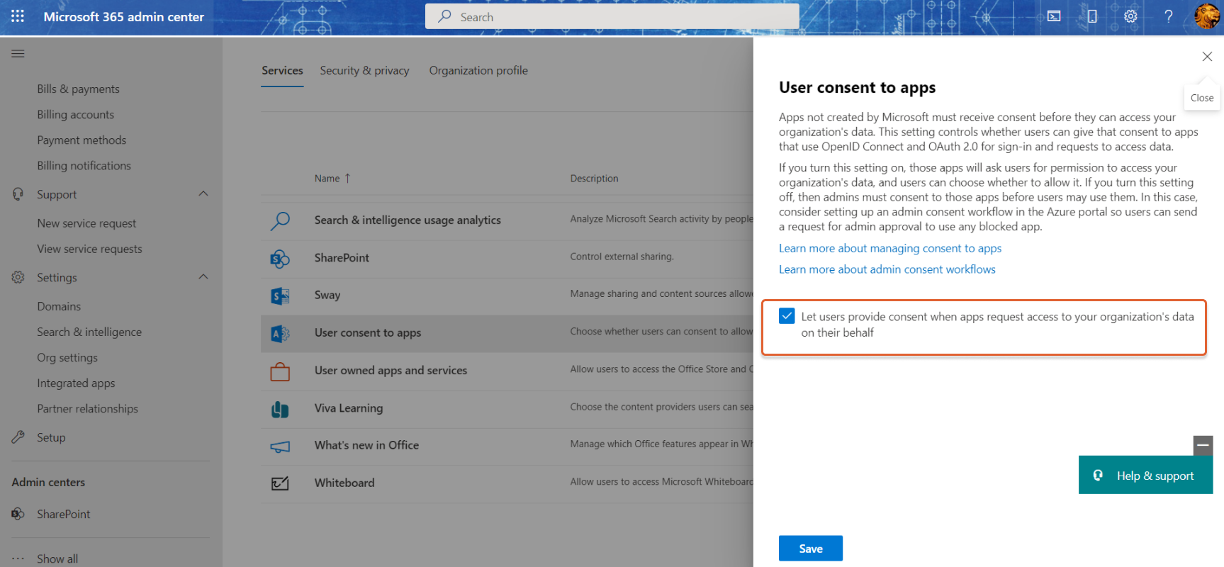 Um die Benutzereinwilligung zu verwalten, navigieren Sie zum Microsoft 365 Admin Center und befolgen dann die hier beschriebenen Schritte.