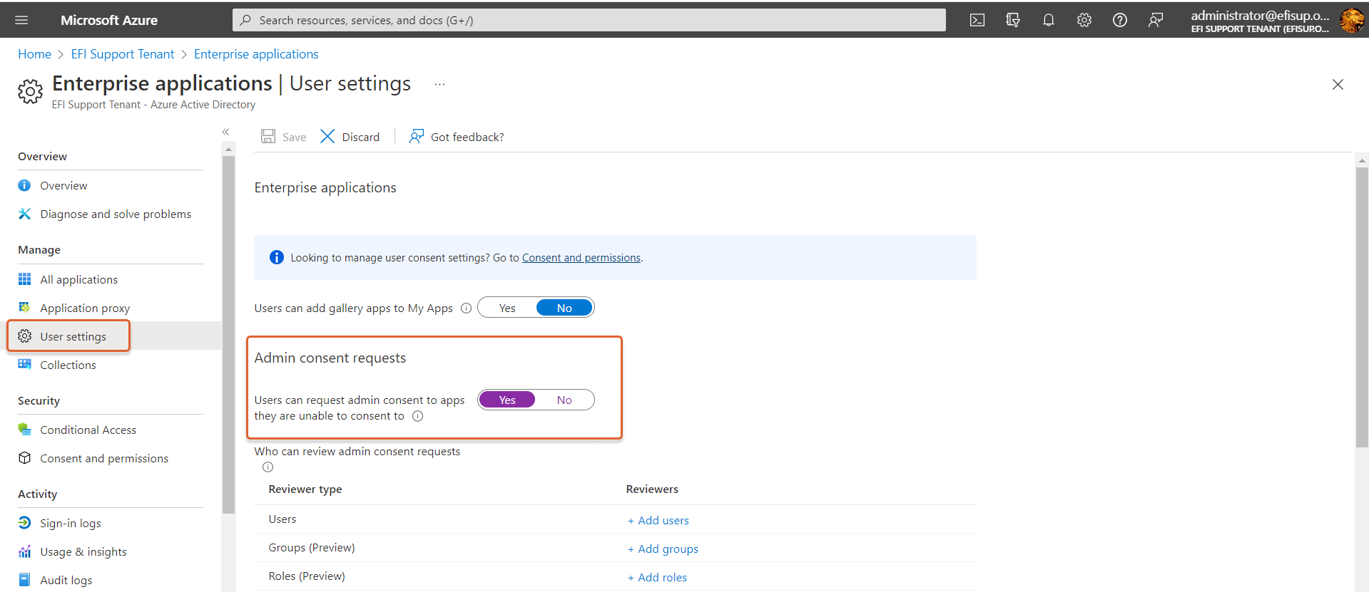 2. Wenn die Benutzereinwilligung deaktiviert ist oder eine solche nicht im Einklang mit den Richtlinien Ihrer Organisation steht, kann ein globaler Microsoft 365-Administrator einen Administratoreinwilligungsfluss konfigurieren, um festzulegen, welche Benutzer Anfragen zu Administratoreinwilligungen prüfen dürfen.