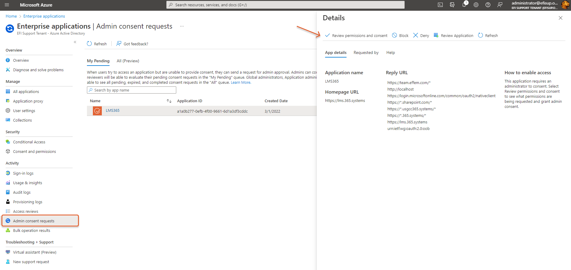 Zum Konfigurieren der Administratoreinwilligung navigieren Sie zu Microsoft Entra ID (vormals Azure Active Directory) und befolgen dann die hier beschriebenen Schritte.