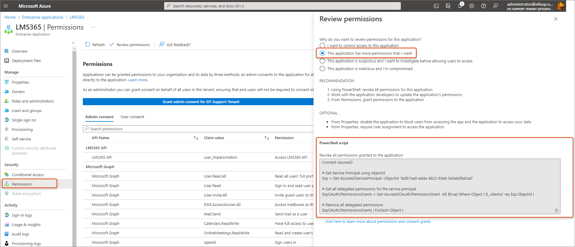 Dies geschieht unter Microsoft Entra ID (vormals Azure Active Directory) > Enterprise-Apps > LMS365 > Sicherheit > Berechtigungen > Berechtigungen überprüfen. Klicken Sie nun auf Diese Anwendung hat mehr Berechtigungen, als ich es möchte. Dann befolgen Sie die Empfehlung, die den Apps erteilten Berechtigungen zu prüfen und via PowerShell zurückzusetzen.