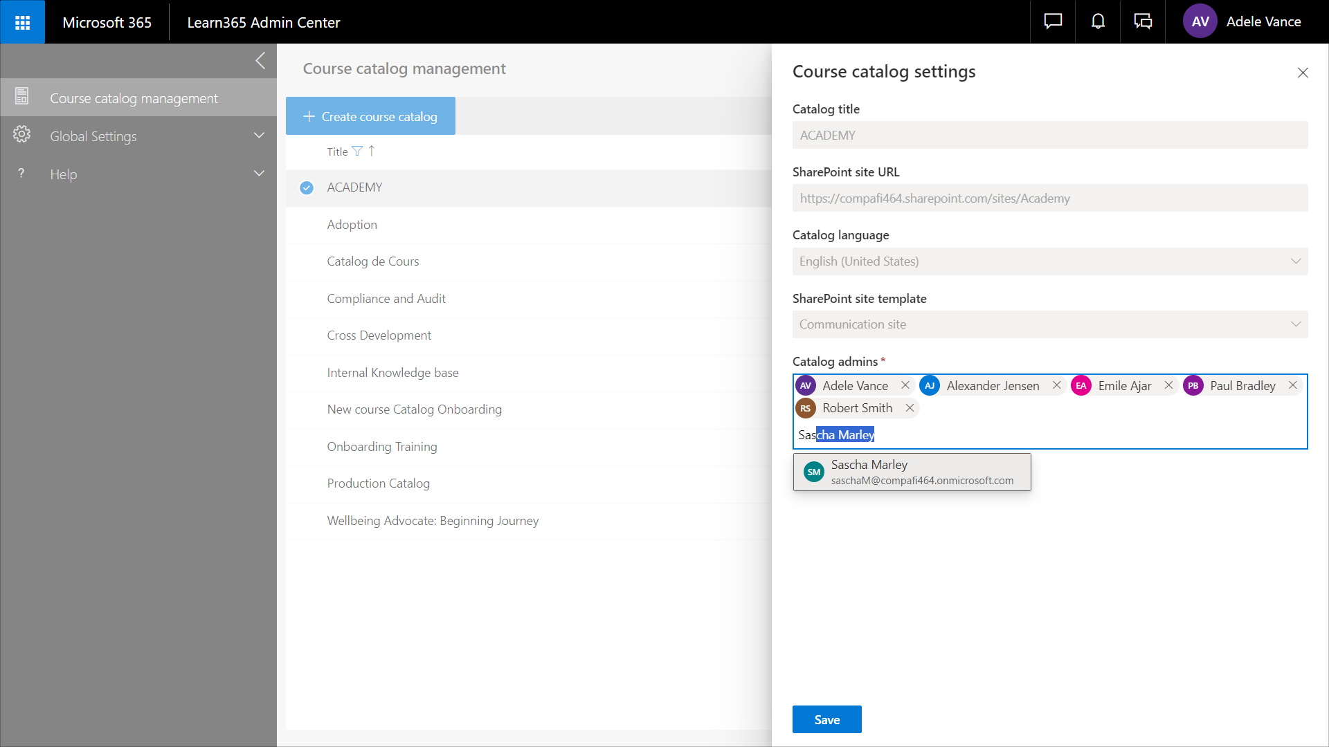 1. Gehen Sie zu Learn365 Admin Center > Globale Einstellungen > Kurskatalogverwaltung > Wählen Sie den relevanten Katalog aus > Kurskatalogeinstellungen.