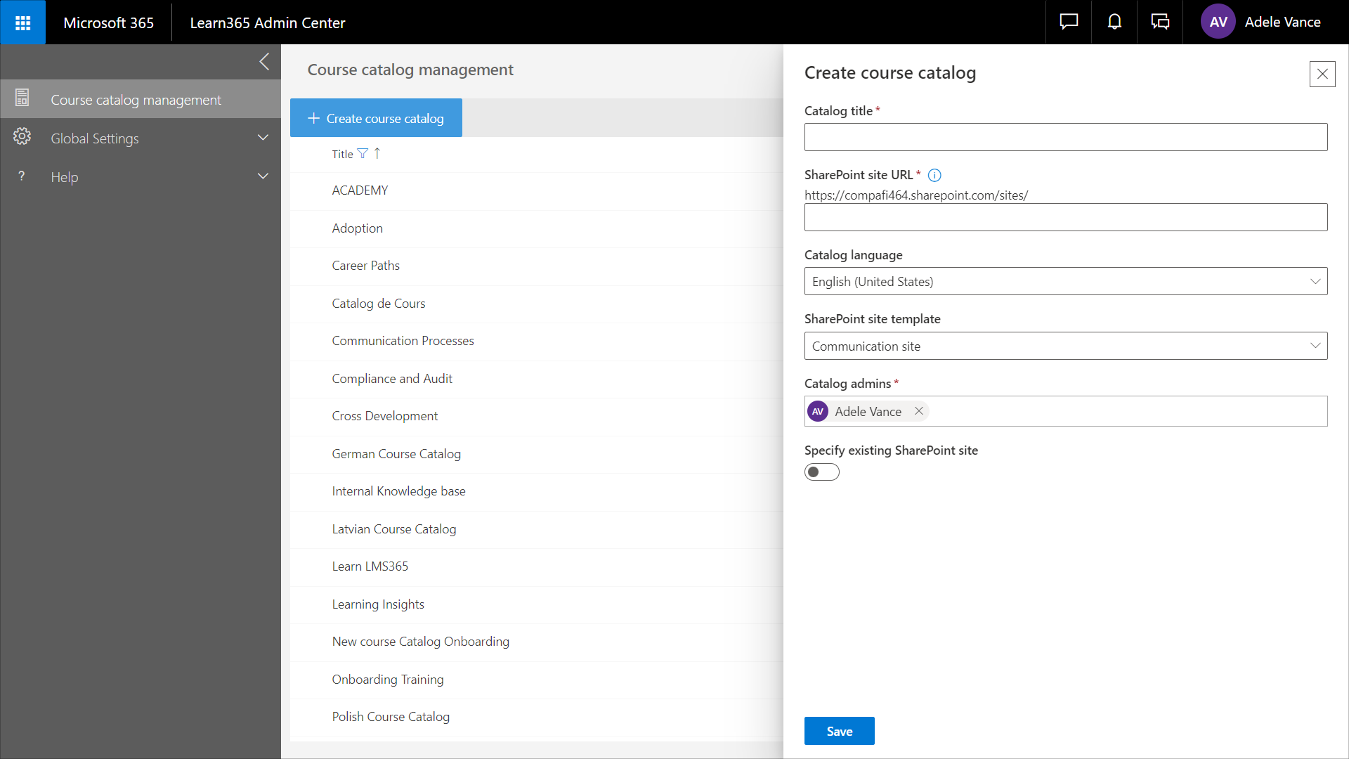 Erforderliche Rolle zur Durchführung des Schritts: Kurskataloge in Learn365 können entweder von einem Microsoft 365 globalen Administrator oder von einem SharePoint Administrator erstellt werden. Diese Microsoft 365-Rollen werden in Ihrem Microsoft 365 Admin Center verwaltet.