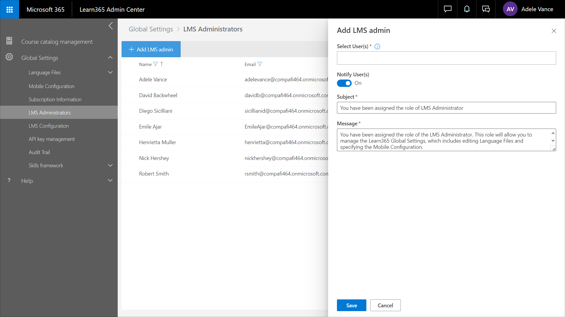 1. Gehen Sie zu Learn365 Admin Center > Globale Einstellungen > LMS-Administratoren > LMS-Administrator hinzufügen. Der Bereich LMS-Administrator hinzufügen wird geöffnet.