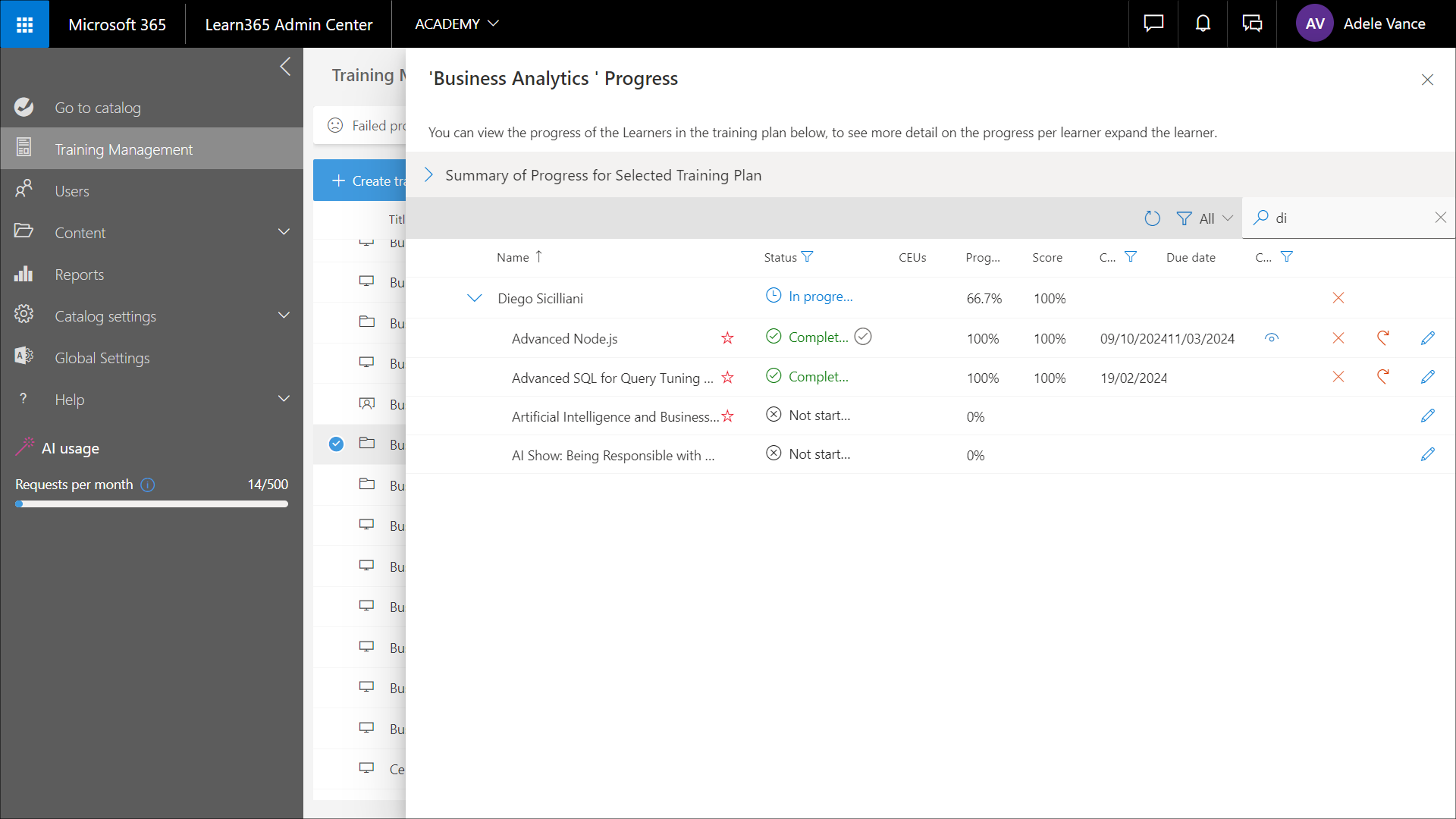 Wählen Sie den Namen des Lernenden aus, um den Bereich Aktionen aufzurufen. Hier finden Sie die Tools, die Sie brauchen, um den Fortschritt des Lernenden beim Schulungsplan zu verwalten.