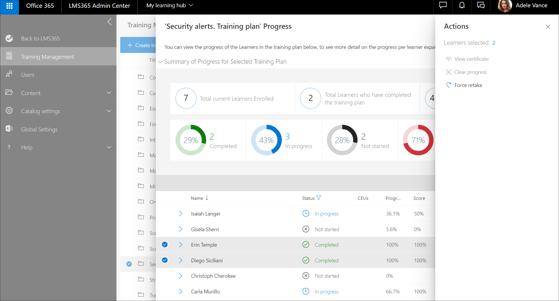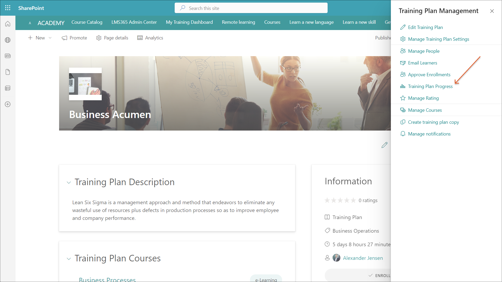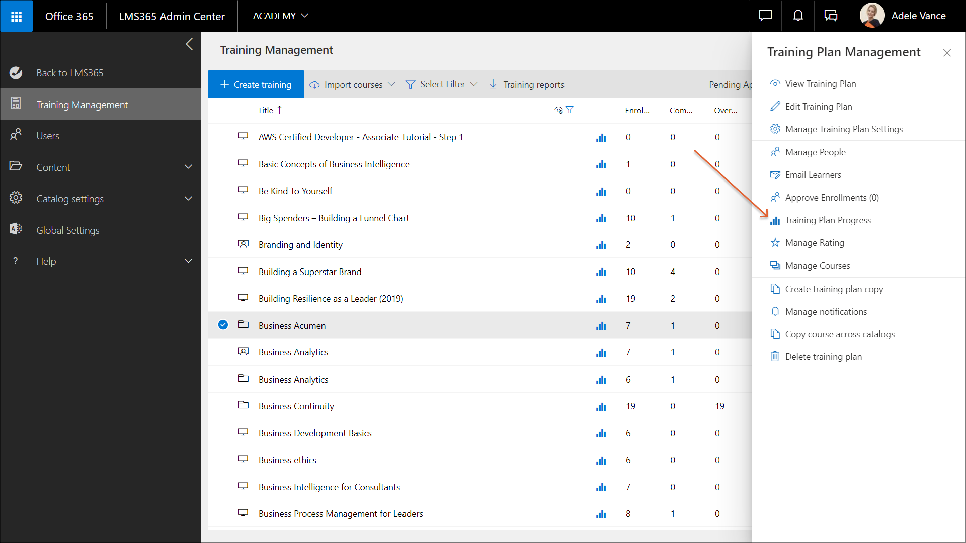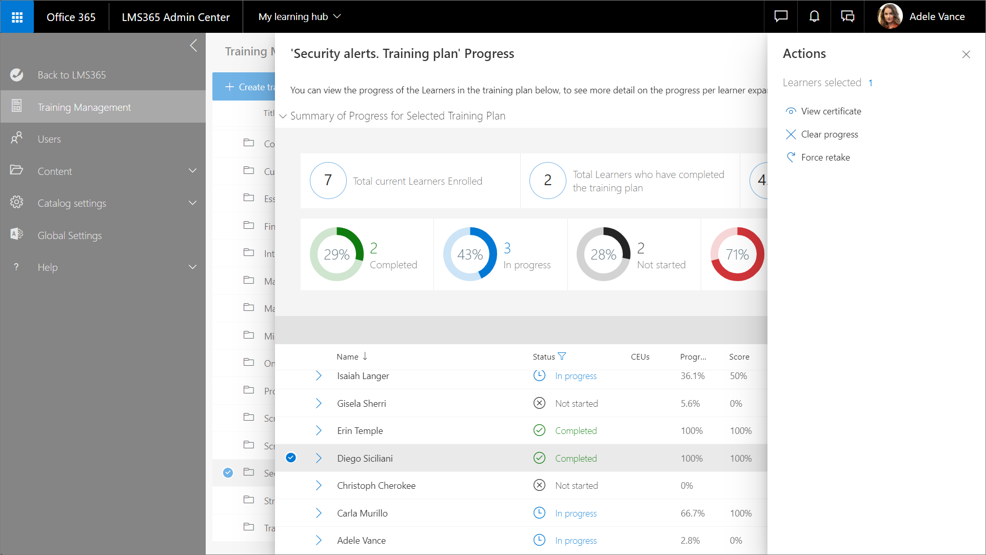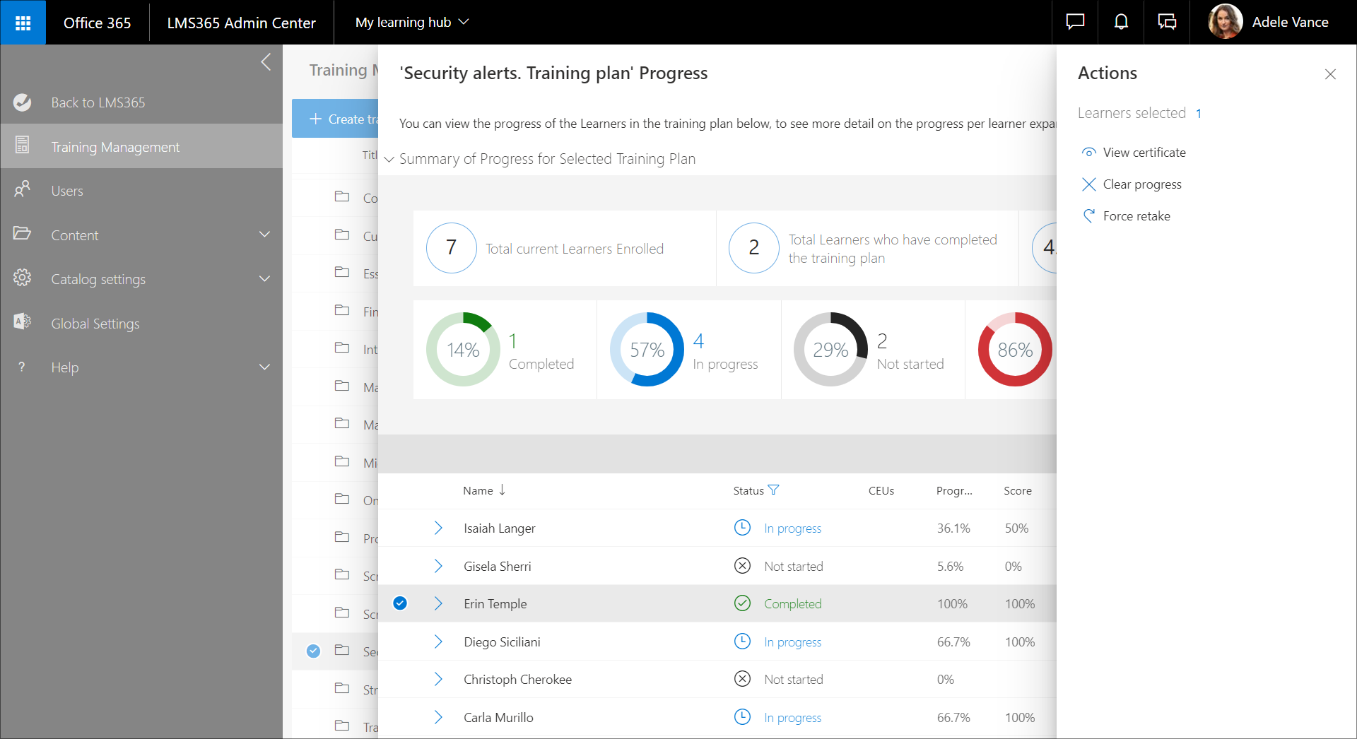 - Gehen Sie zu Learn365 Admin Center >Schulungsverwaltung, wählen Sie den gewünschten Schulungsplan aus, und klicken Sie im Bereich Schulungsplanverwaltung auf Schulungsplanfortschritt.