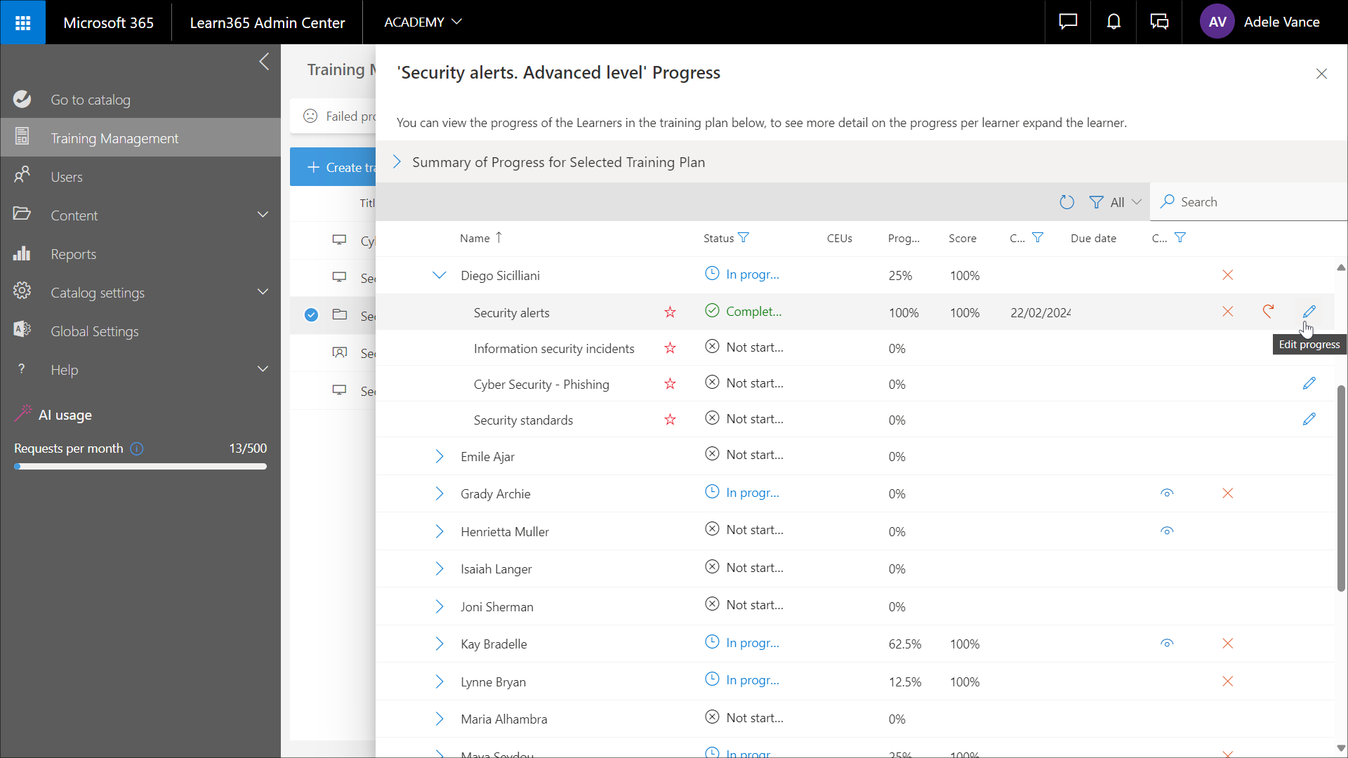 2. Klicken Sie auf das Symbol Fortschritt bearbeiten neben dem Kurs, bei dem Sie den Fortschritt des Lernenden bearbeiten möchten.