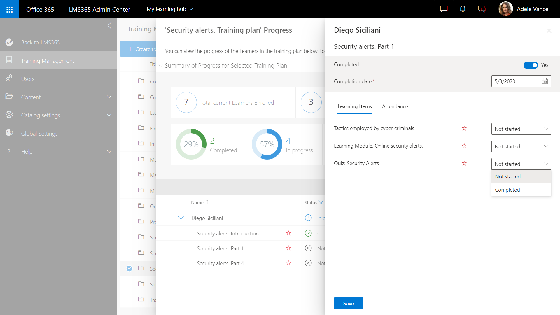 Weitere Informationen über den Abschlussstatus eines Schulungsplans und dessen Verwaltung finden Sie in diesem Artikel.