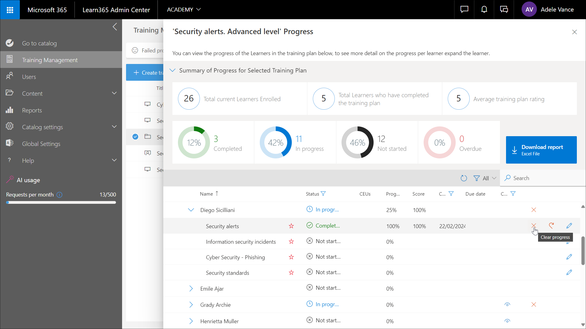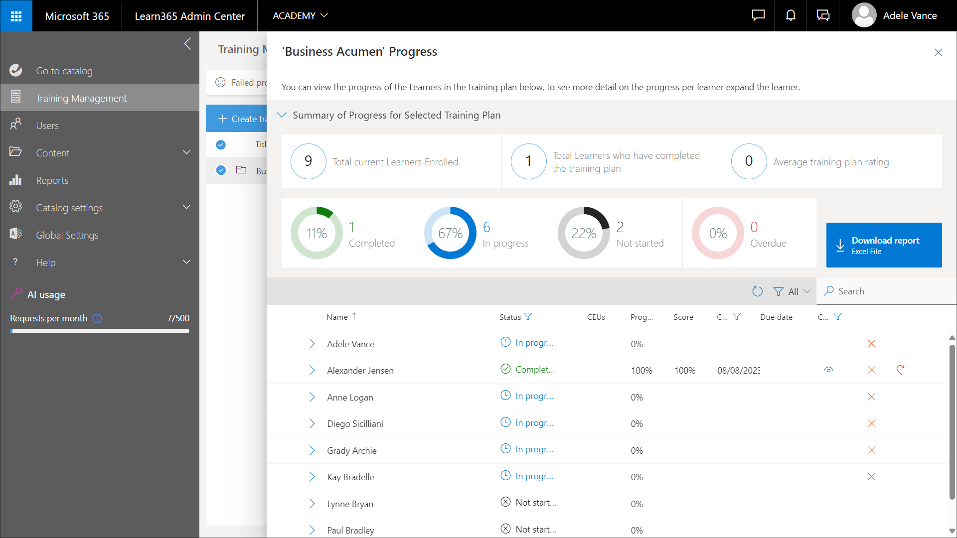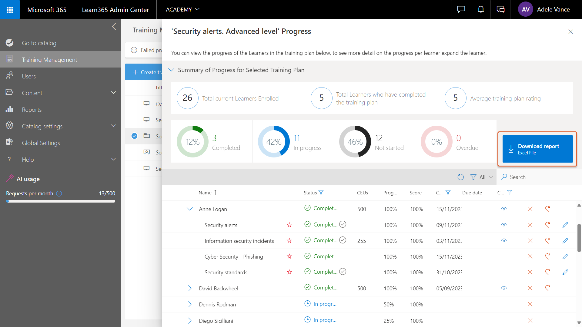 Klicken Sie auf Bericht herunterladen, um einen Bericht zum Schulungsplanfortschritt im Excel-Format herunterzuladen. Der Bericht zeigt Informationen in der Sprache Ihres Browsers an, sofern diese Sprache von Learn365 unterstützt wird. Andernfalls erfolgt die Anzeige der Informationen auf Englisch.