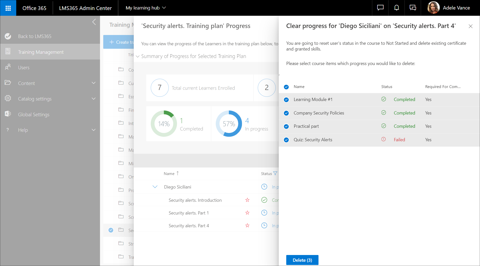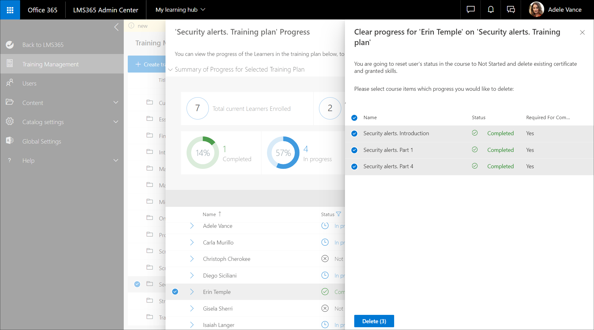 Abhängig vom Schulungsplanfortschritt können Sie den Fortschritt eines Lernenden löschen: