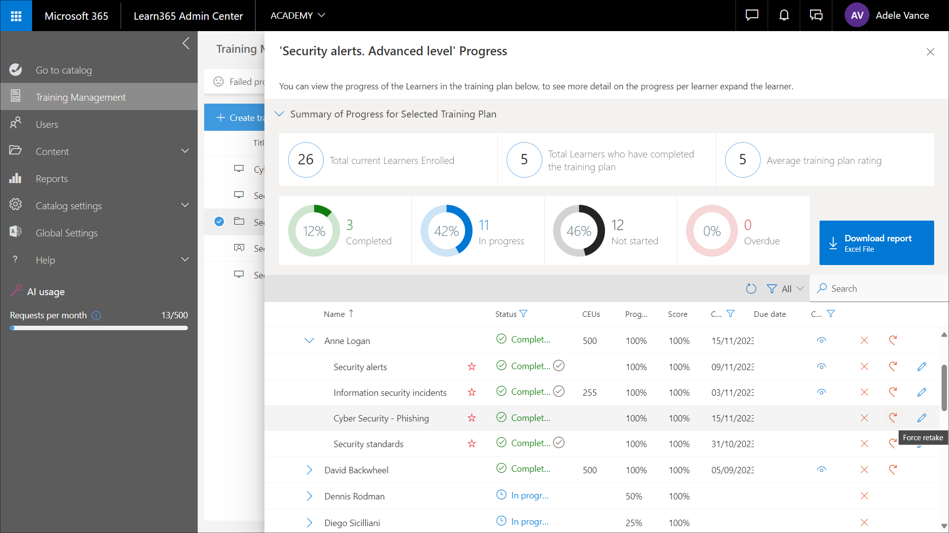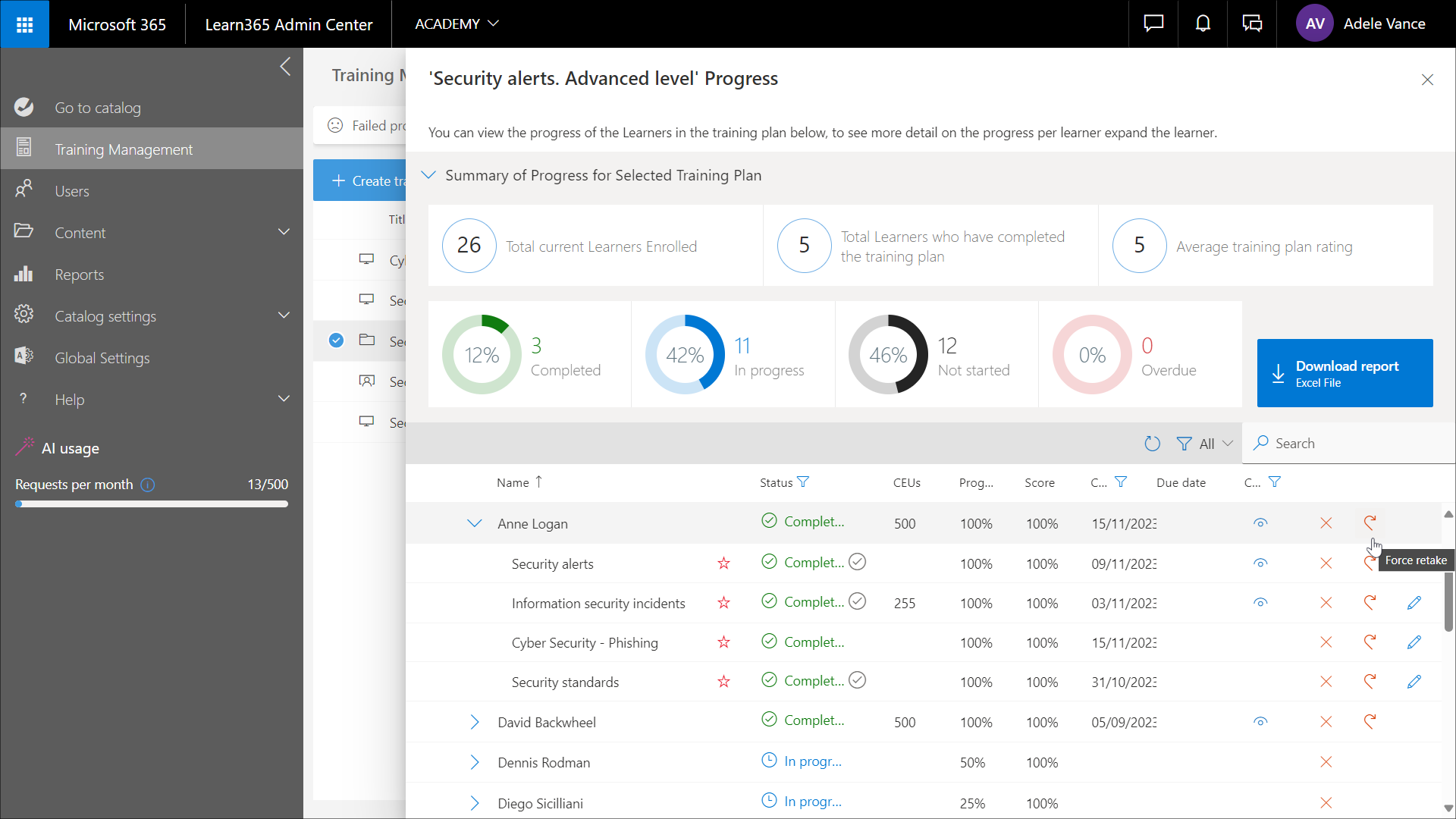 - Wählen Sie den Namen des Lernenden aus, um den Bereich Aktionen zu öffnen, und klicken Sie hier auf Wiederholung erzwingen. Diese Aktion ist sowohl bei Auswahl eines einzelnen Lernenden als auch mehrerer Lernender verfügbar.