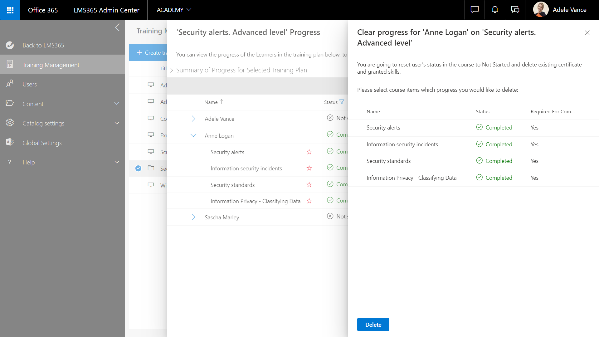 - Fortschritt eines Lernenden bei einem einzelnen Kurs innerhalb eines Schulungsplans löschen