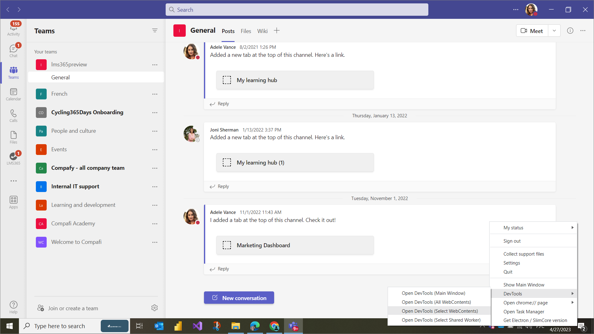1. Klicken Sie im Infobereich bzw. in der Systemprozessablage mehrmals auf die Microsoft Teams-App, und klicken Sie dann mit der rechten Maustaste darauf, um das Kontextmenü zu öffnen. Klicken Sie auf Entwicklungstools > Entwicklungstools öffnen (WebContents auswählen) > WebView. Das Fenster Entwicklertools öffnet sich.