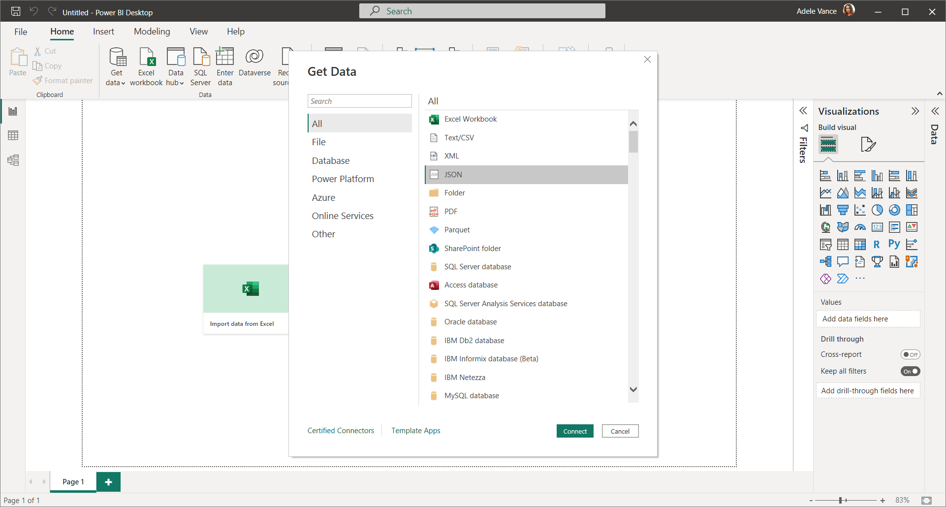 The Get Data window opens, where you need to select JSON and then Connect to upload to Power BI the downloaded JSON file that contains the audit trail records.