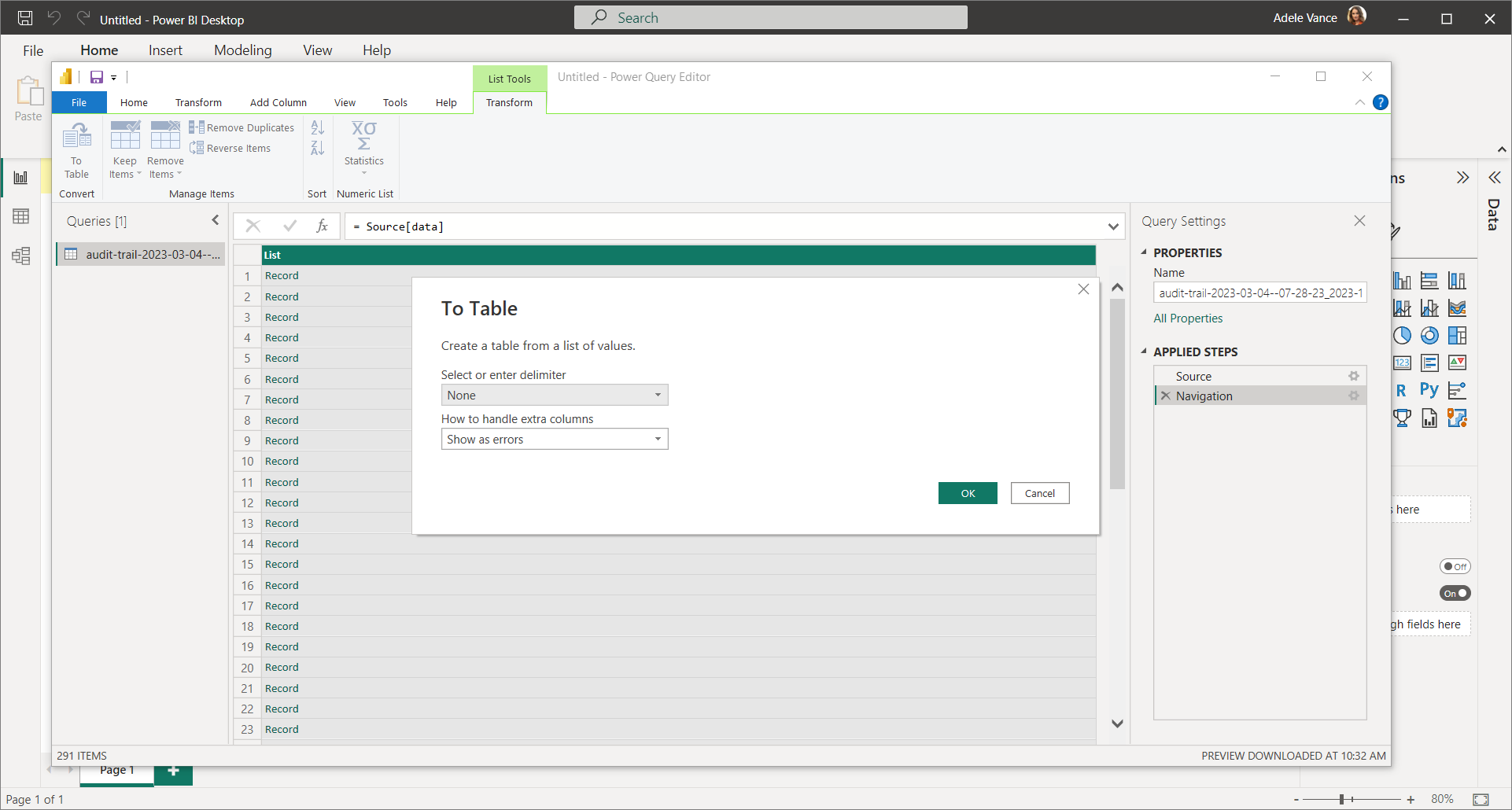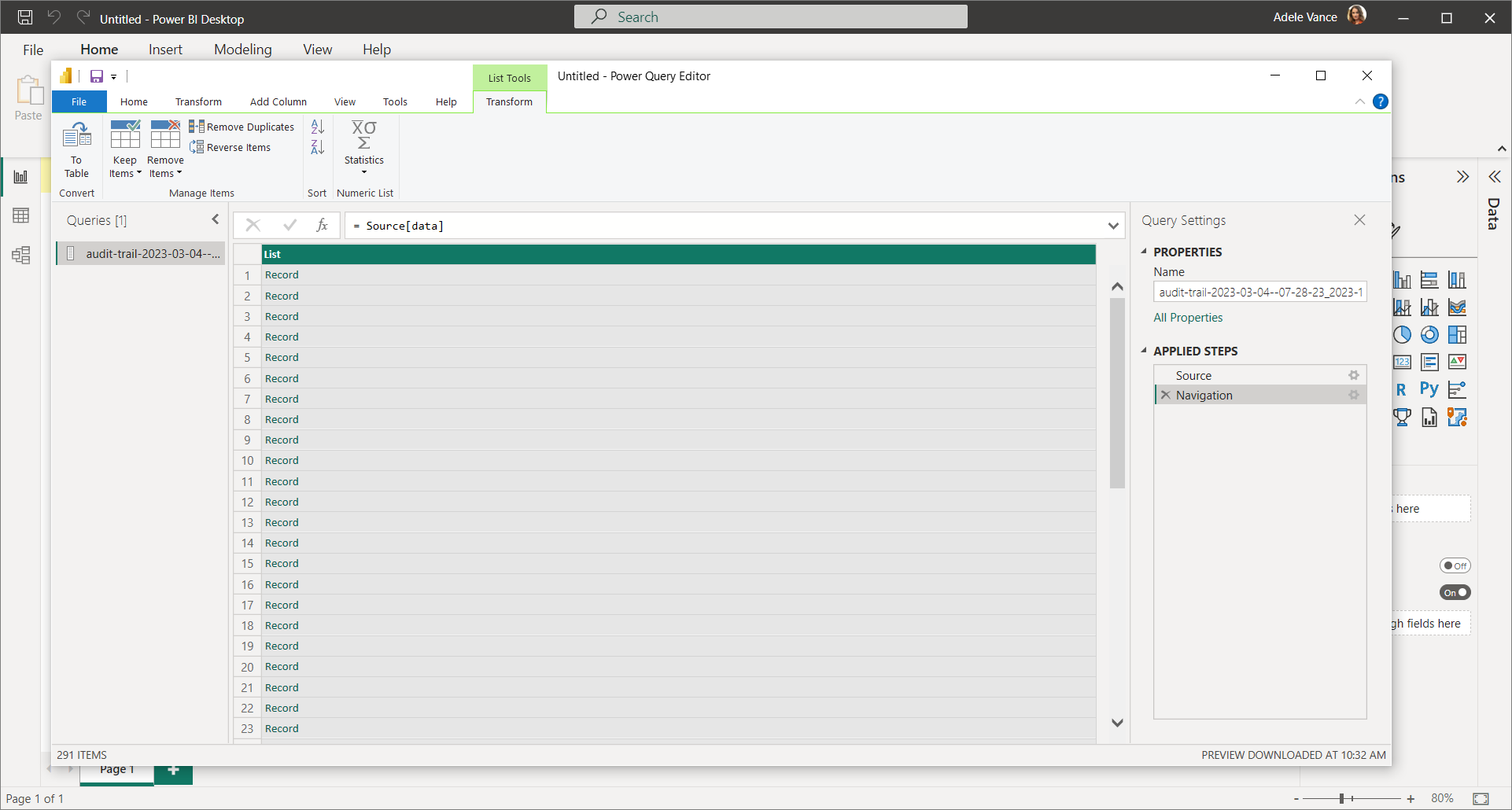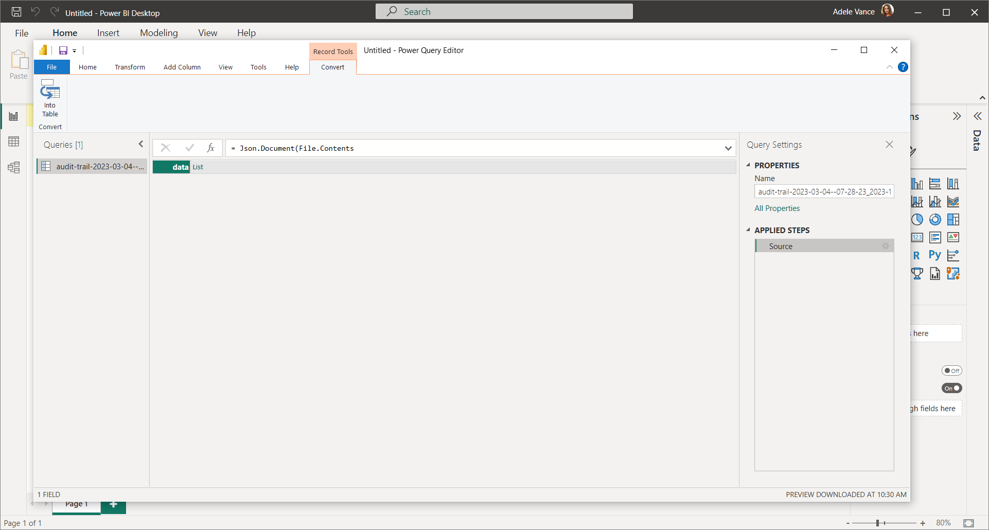 To view audit trail data provided by a JSON file in Power BI, follow these steps: