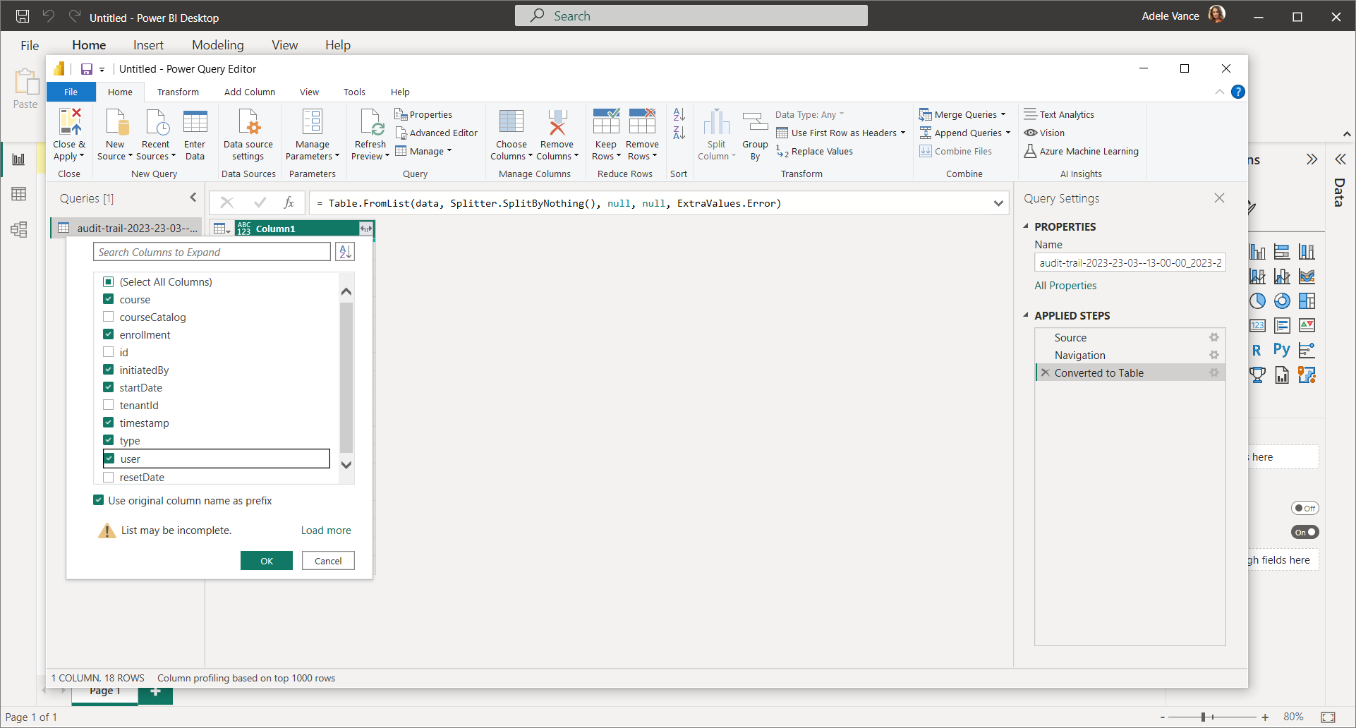 In our case, as we want to get all events related to a specific user at a specific date, we clear all checkboxes to then select only the relevant ones: course, enrollment, initiatedBy, timestamp, type, user. All these selected properties will become columns.