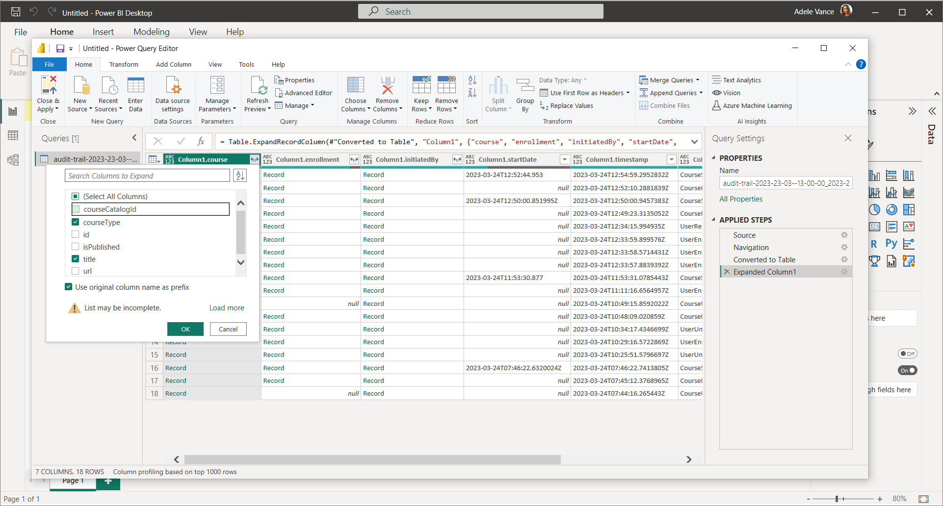 After selecting OK, new columns are displayed. Their titles inherit the title of the parent column, followed by the selected property, for example courseType selected from the ABC Column1.course column is displayed as a column called ABC Column1.course.courseType.