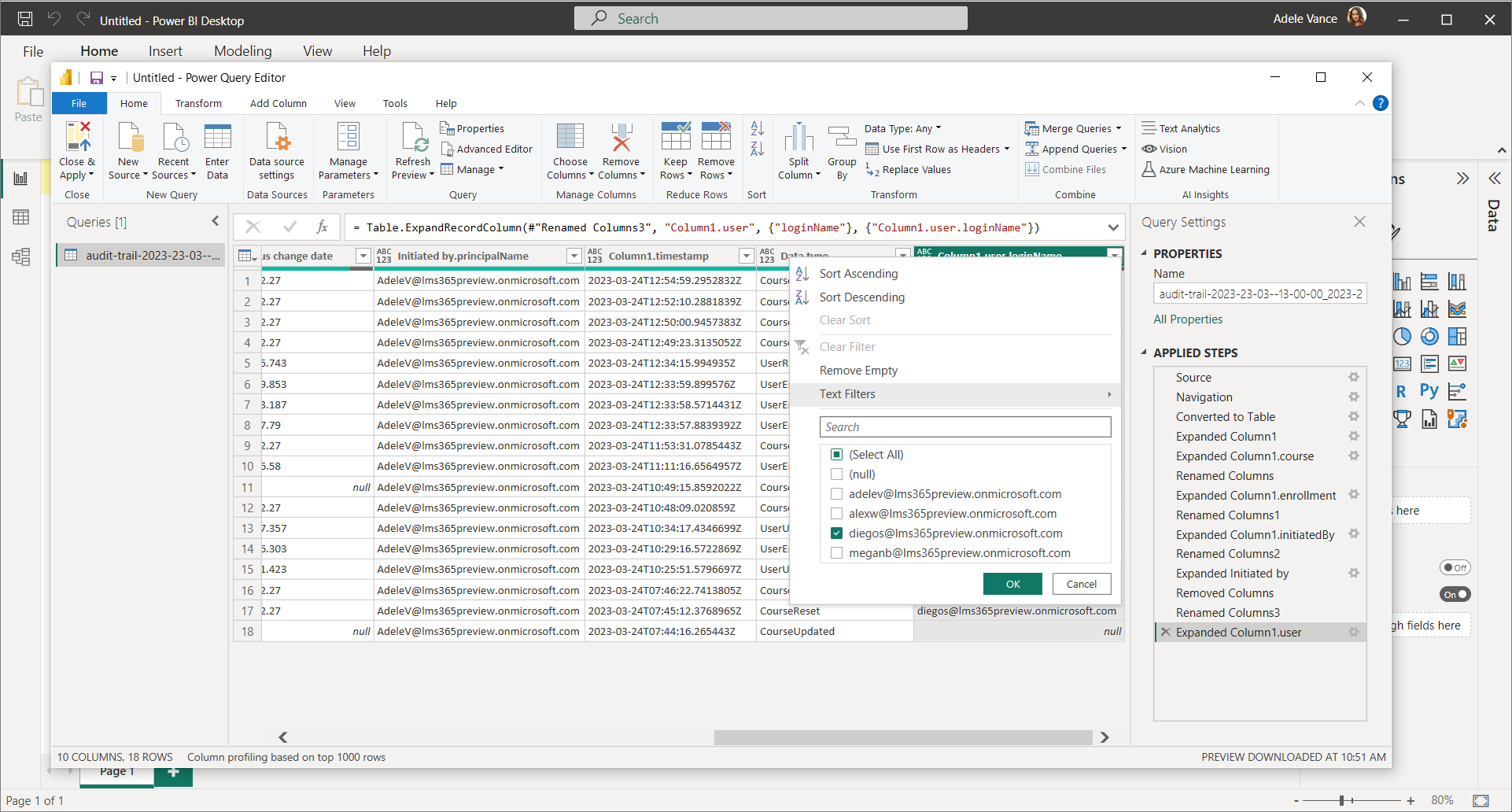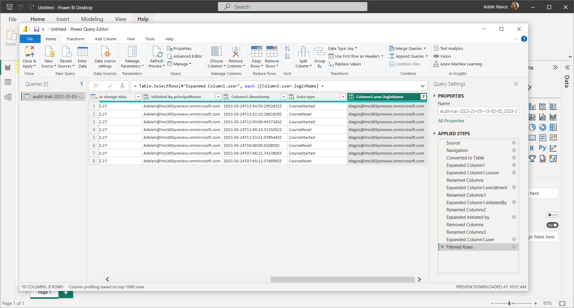 In Power BI, you can work with the downloaded JSON file produced by the Learn365 audit trail feature. Data can be interpreted and filtered for a specific purpose, for example, to find out which users were assigned as catalog admins over a specified date range, or why a certain user hasn't been awarded a skill after completing a course.