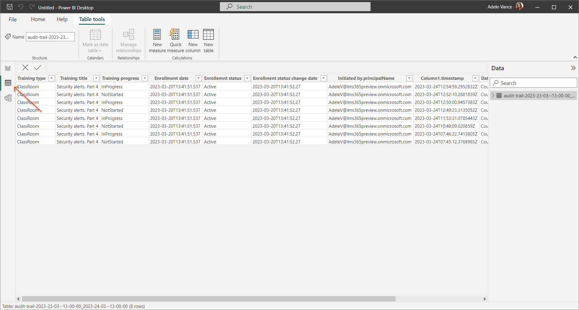 2. When the JSON file is imported, the Record Tools window opens in Power BI with the selected audit trail records file.