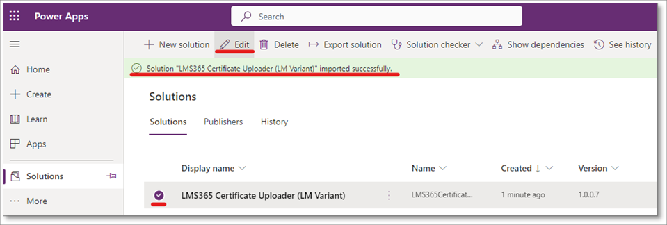 15. Select the newly imported solution and then Edit on the top menu.