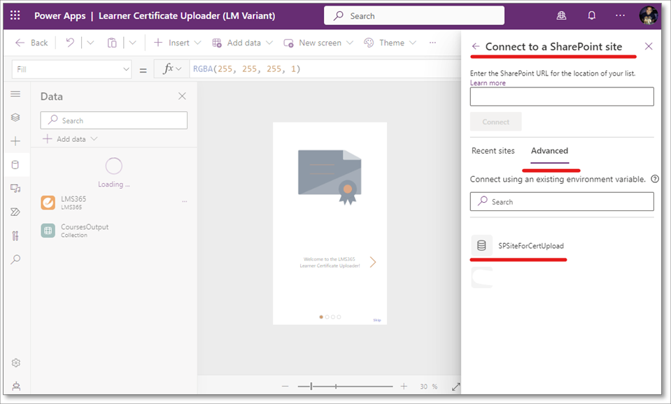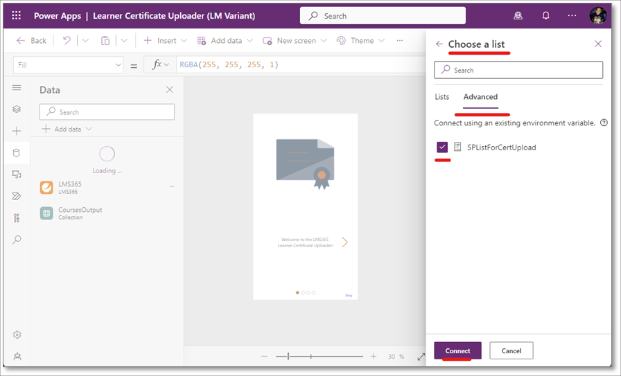23. Select Advanced again and then SPListForCertUpload. Select Connect to add SPListForCertUpload to your Power App again, with the proper connection to your course catalog.
