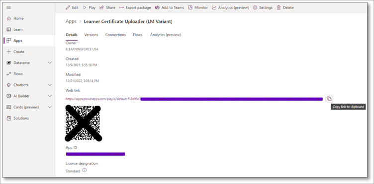 3. Select Copy link to Clipboard to copy your unique App URL. This URL is randomly generated and is unique to your installation of the Learner Certificate Uploader.
