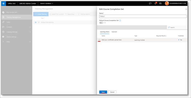 1. Go to the course completion settings in the Learn365 Admin Center > Training Management > select the course > Course completion settings.