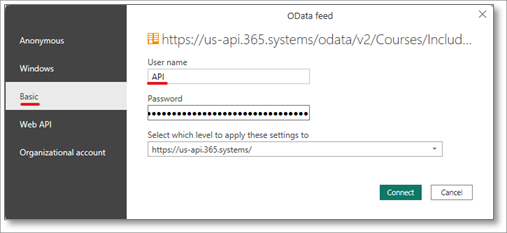 8. If applicable, authenticate your Power BI Report using your Learn365 API Key using Basic Authentication, with API as the User name and your API key as the Password.