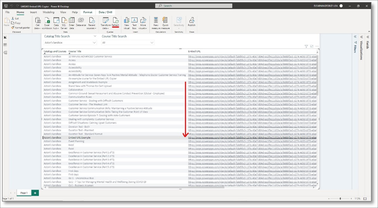 2. Using the fully configured Embed URL Copier report on Power BI Desktop, select Refresh and use the report to find your created course.