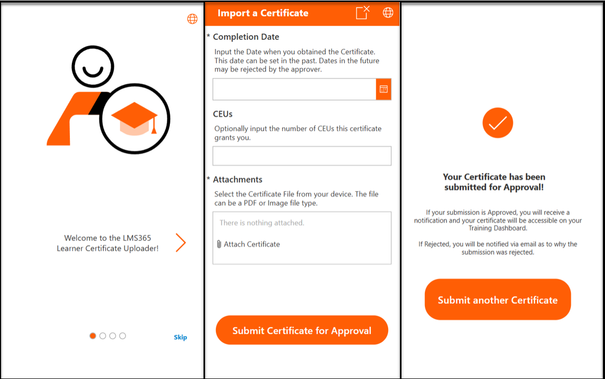 The learner accesses the application that's embedded inside a Learn365 course. After proceeding through the tutorial, a form will enable the learner to upload the certificate file for approval. Once submitted, a confirmation page shows that their certificate will be submitted for approval. The approver will receive a notification in Microsoft Teams and via email, asking them to approve or reject the submission. Once approved, the learner will be notified via email that their certificate was approved and their training record in Learn365 has been updated.