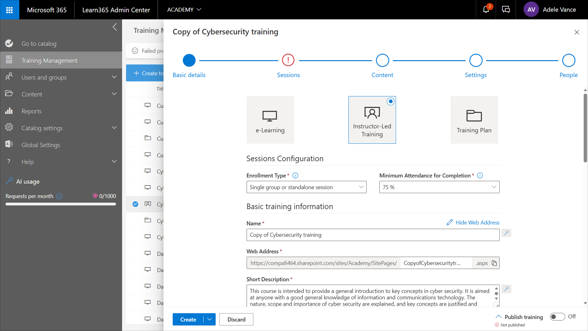 • The Web Address filed is automatically expanded and preconfigured with Copyof(course name), for example https://compafi464.sharepoint.com/sites/Academy/SitePages/CopyofDataVisualization.aspx.