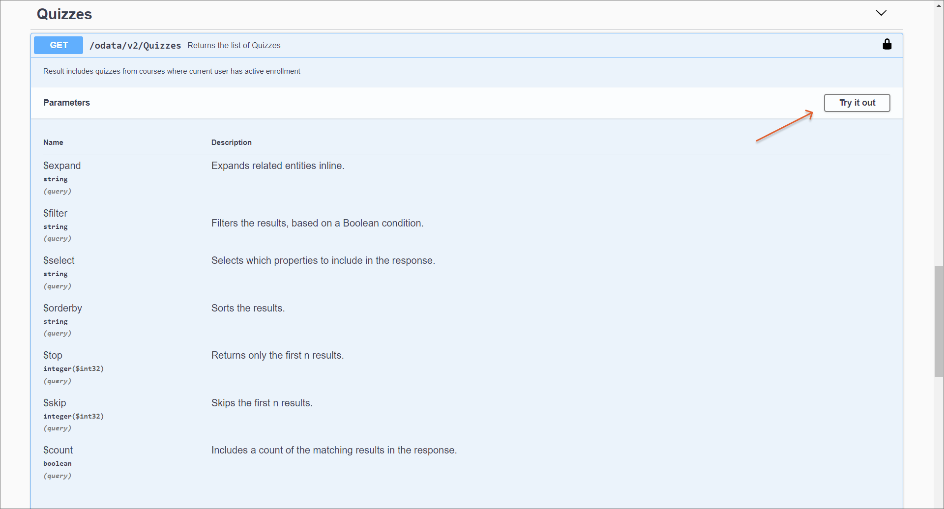 1. In https:/api.365.systems, navigate to the Quizzes section, expand it, find GET /odata/v2/Quizzes (this returns a list of all quizzes on the tenant), and select Try it out in the top right-hand corner.