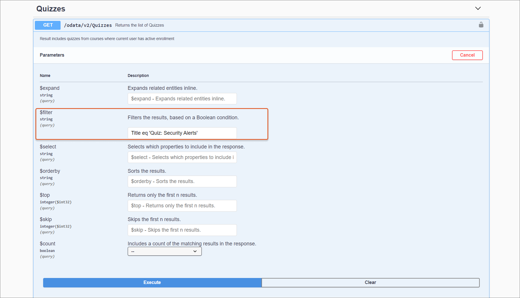 In the $filter field, enter Title eq 'quiz title', as shown in the following image. As a result, the response will show results for this quiz only. The information returned will include the quiz ID.