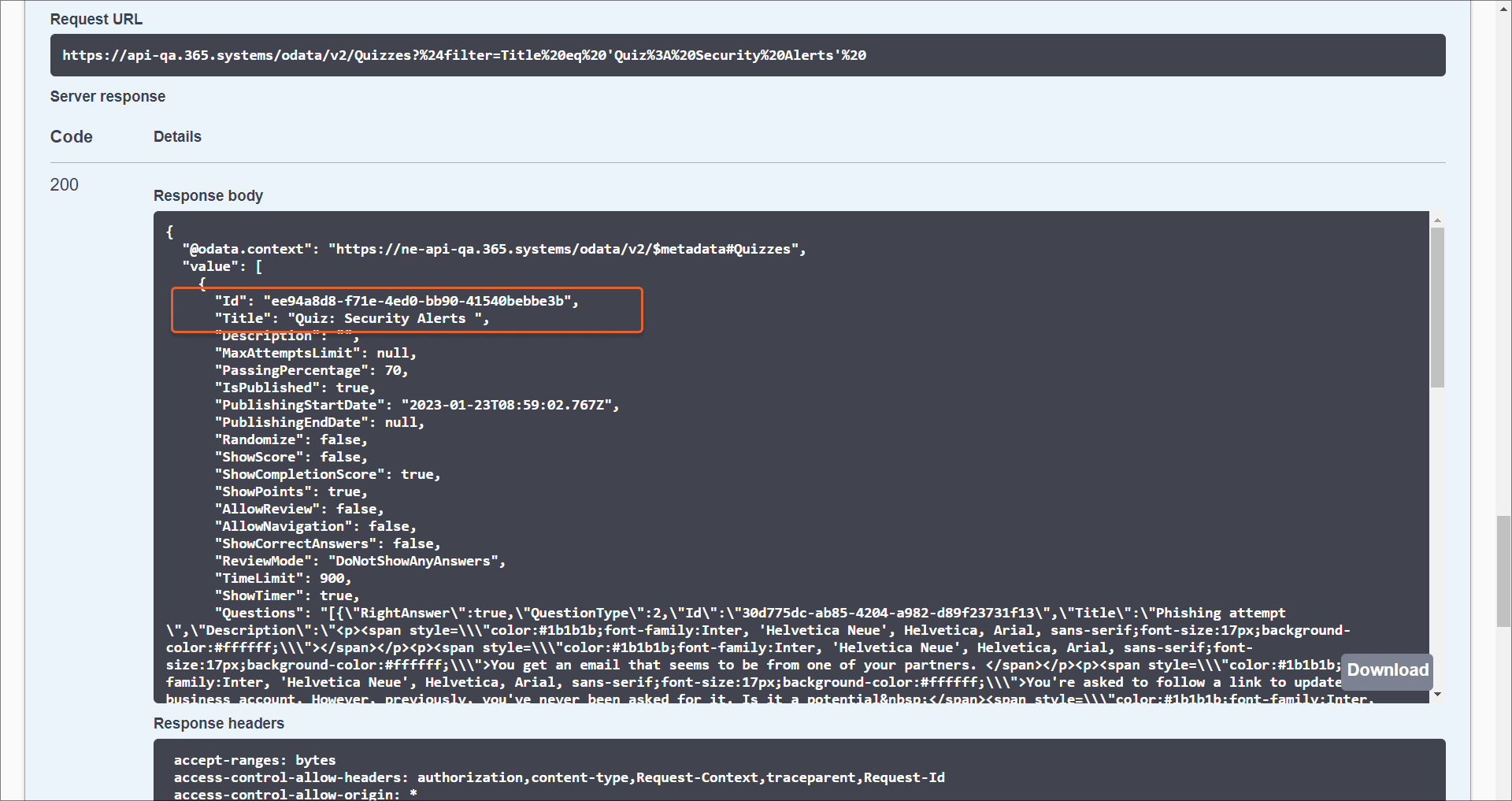 - If no query parameters were set in the Parameters block to narrow the response, in the Response body field you can see all the quizzes on the tenant and their data, including their IDs. Search via Ctrl+F for a specific quiz ID or title and copy it to use wherever you want.