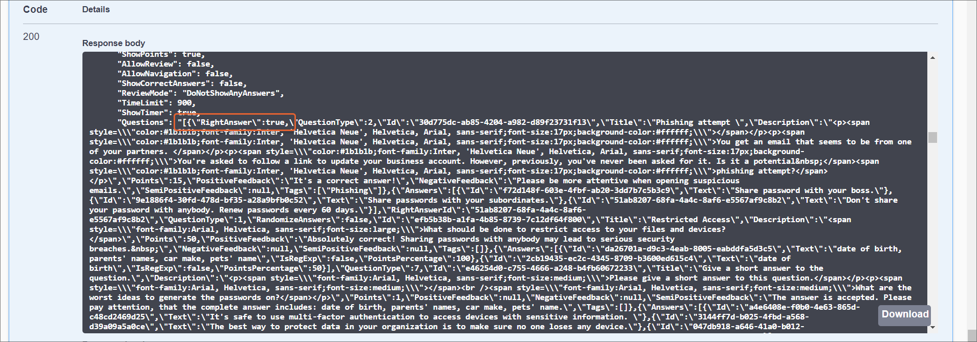 - The correct answer to a True or false question type is displayed as true or false in the RightAnswer parameter, and doesn't contain the correct answer ID.