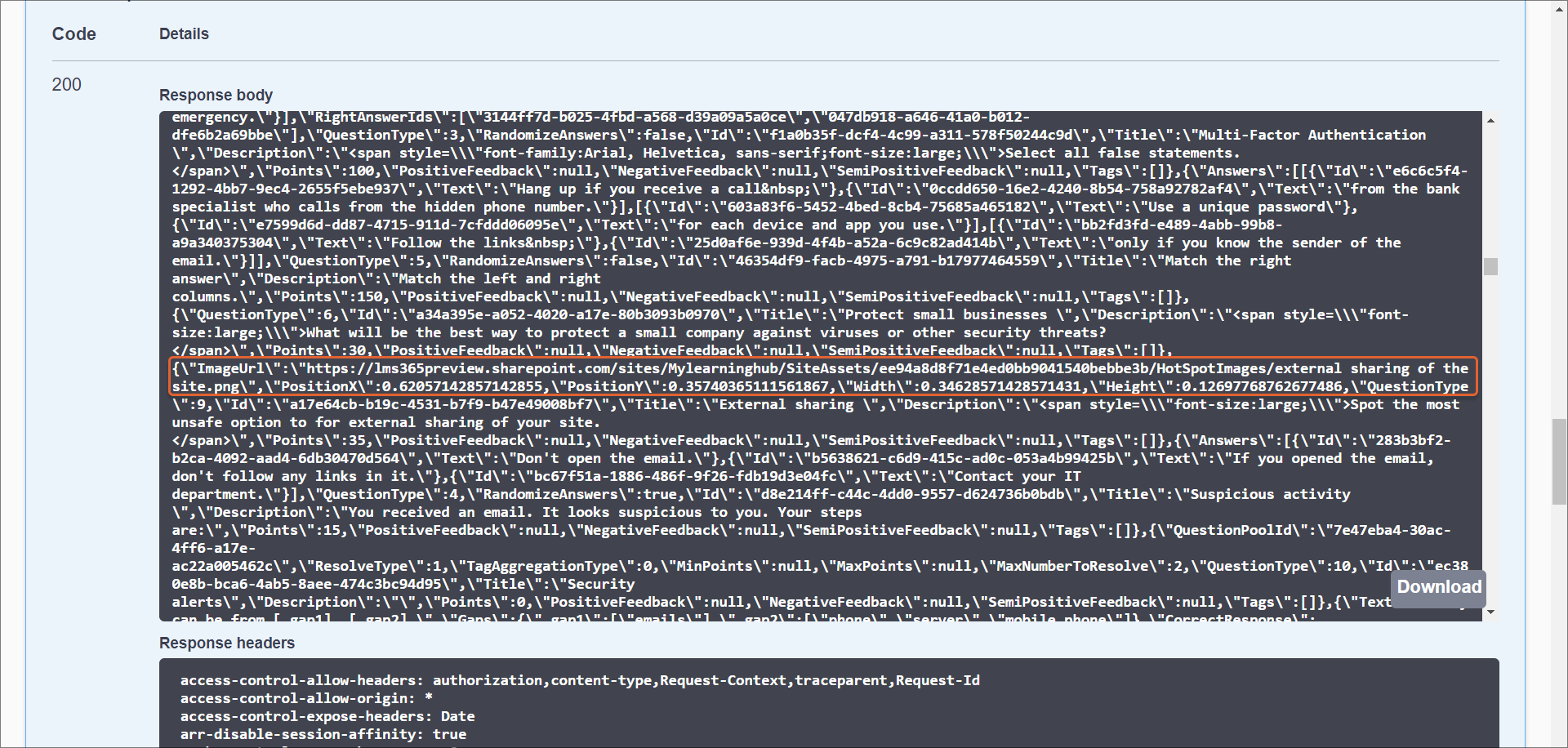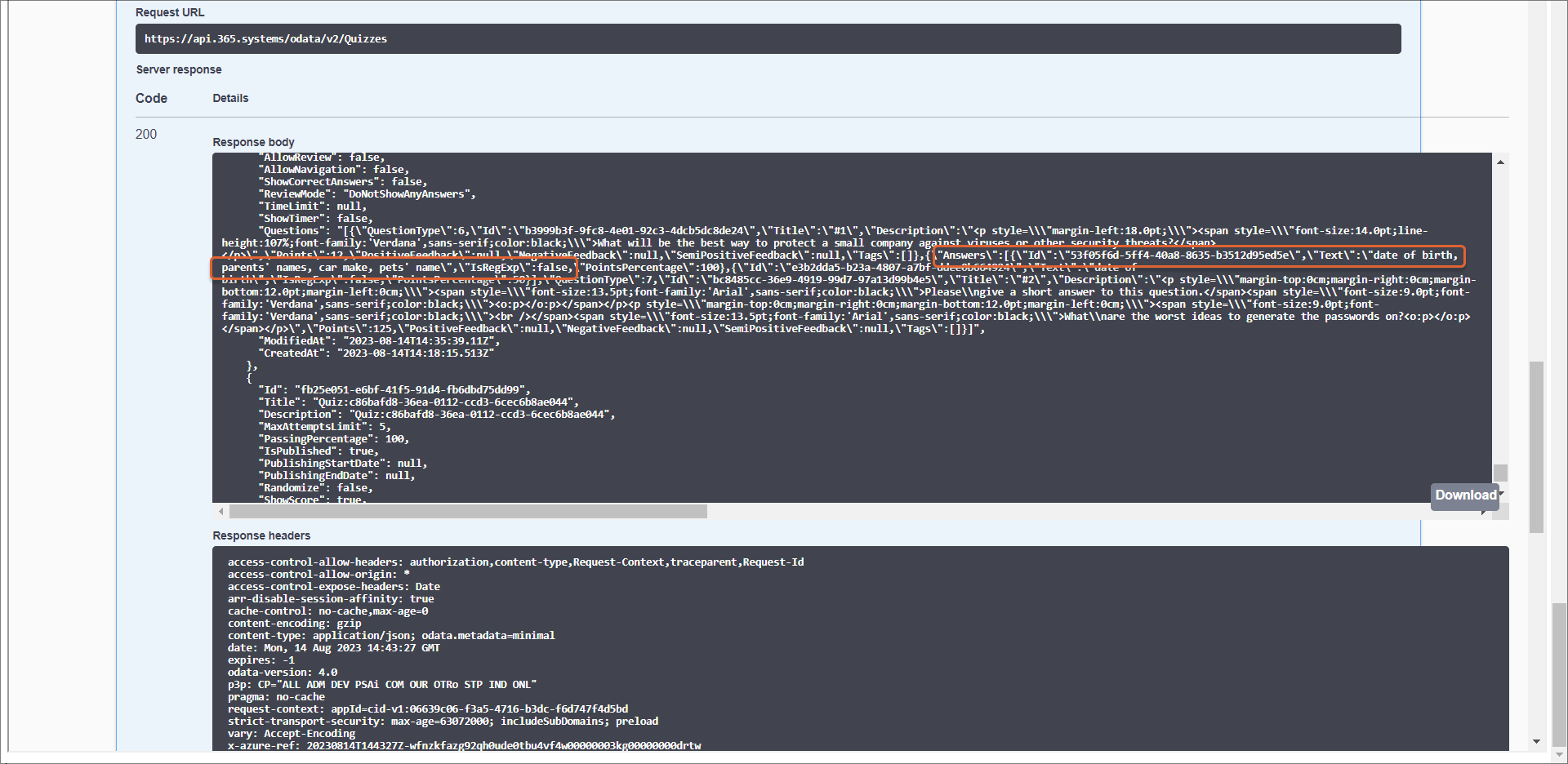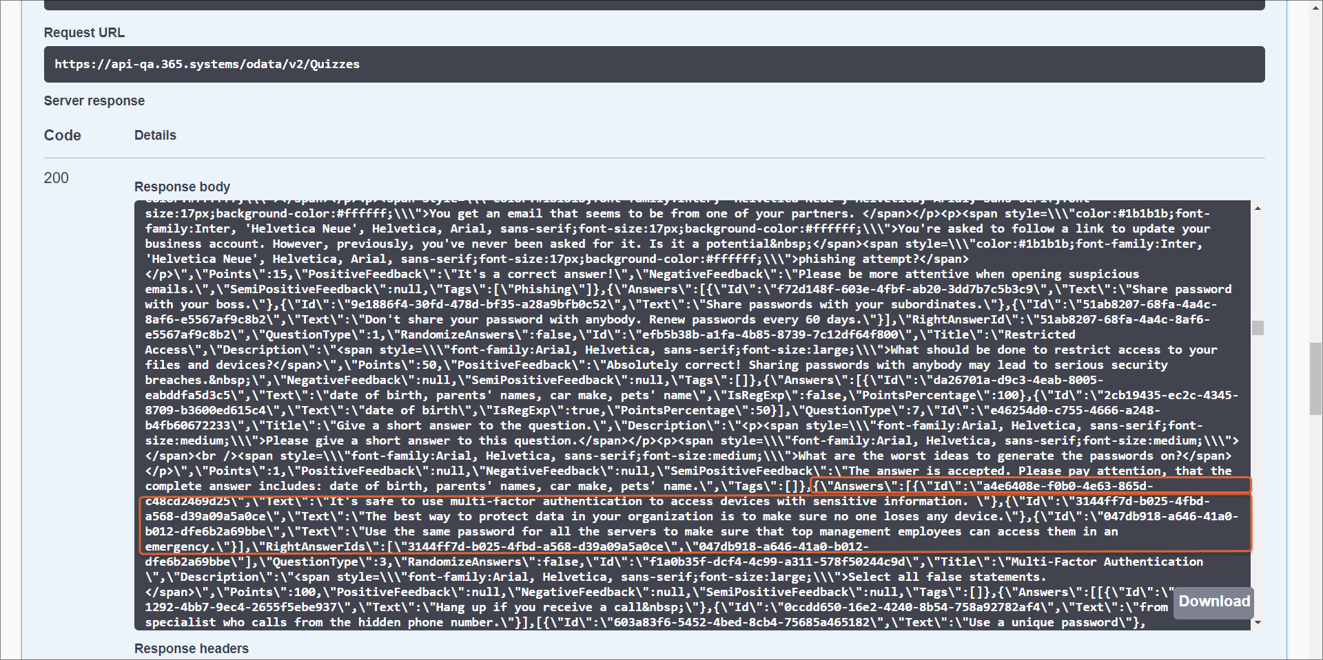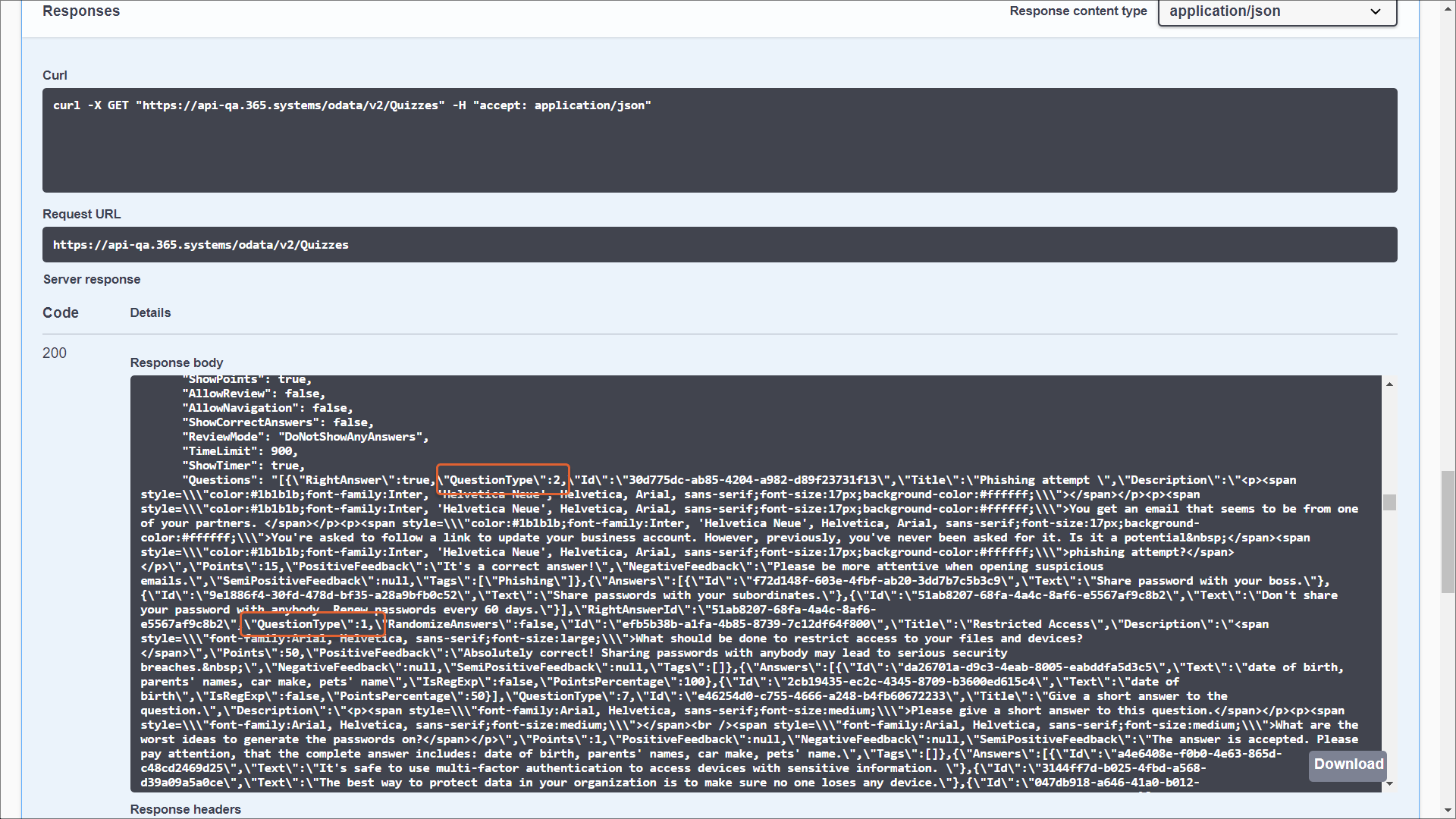 The Questions string in the Response body contains both general and specific information about quiz questions.