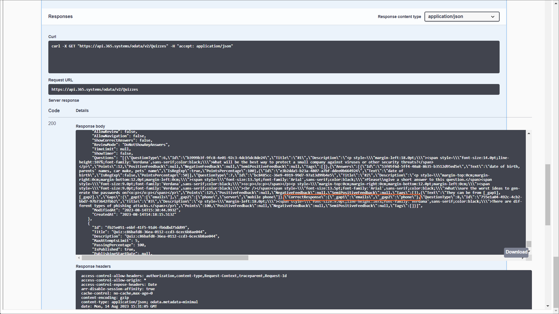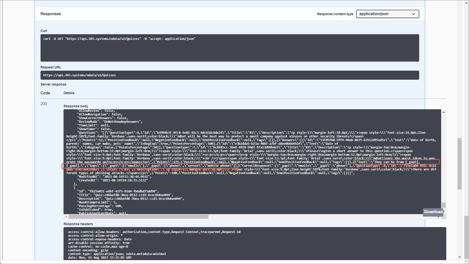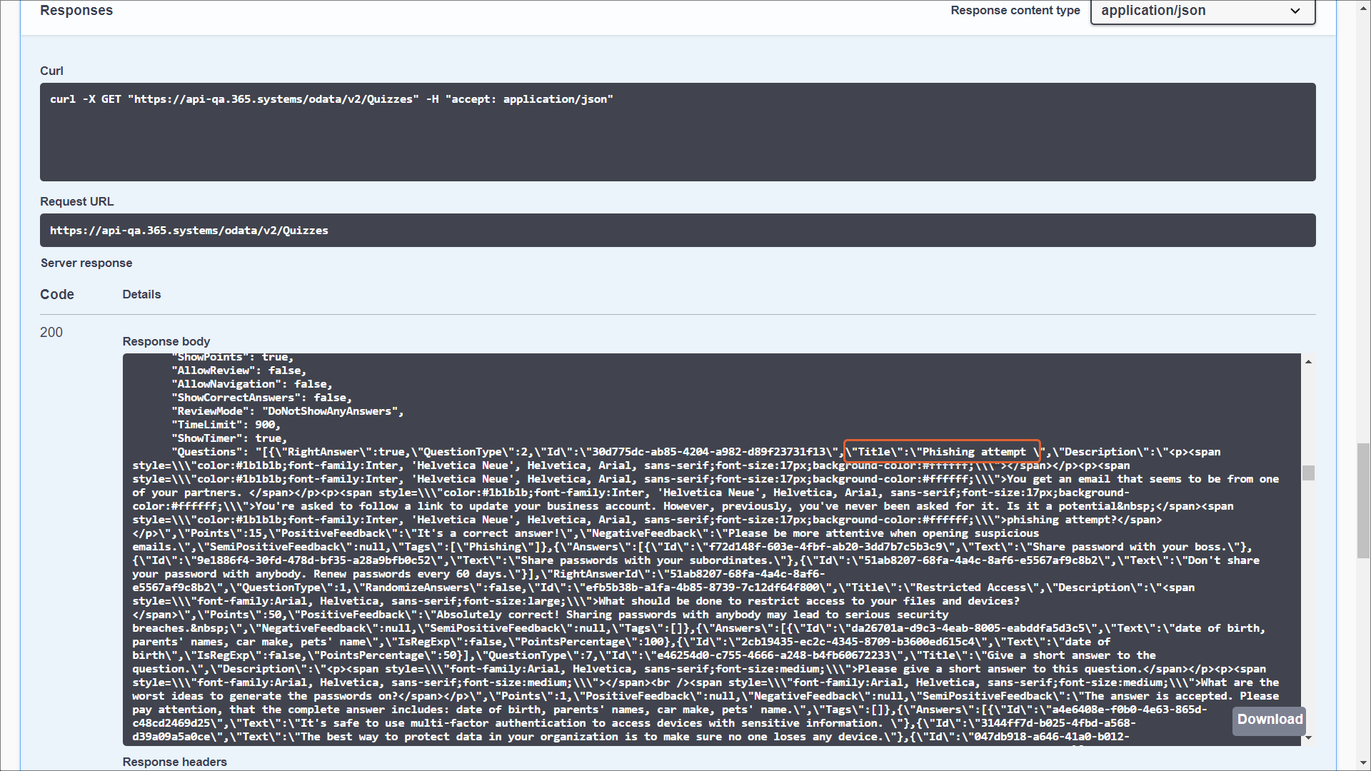 In this article, we'll show you how to read the Questions string in the Response body of GET requests made in the Quizzes section of the Learn365 API.