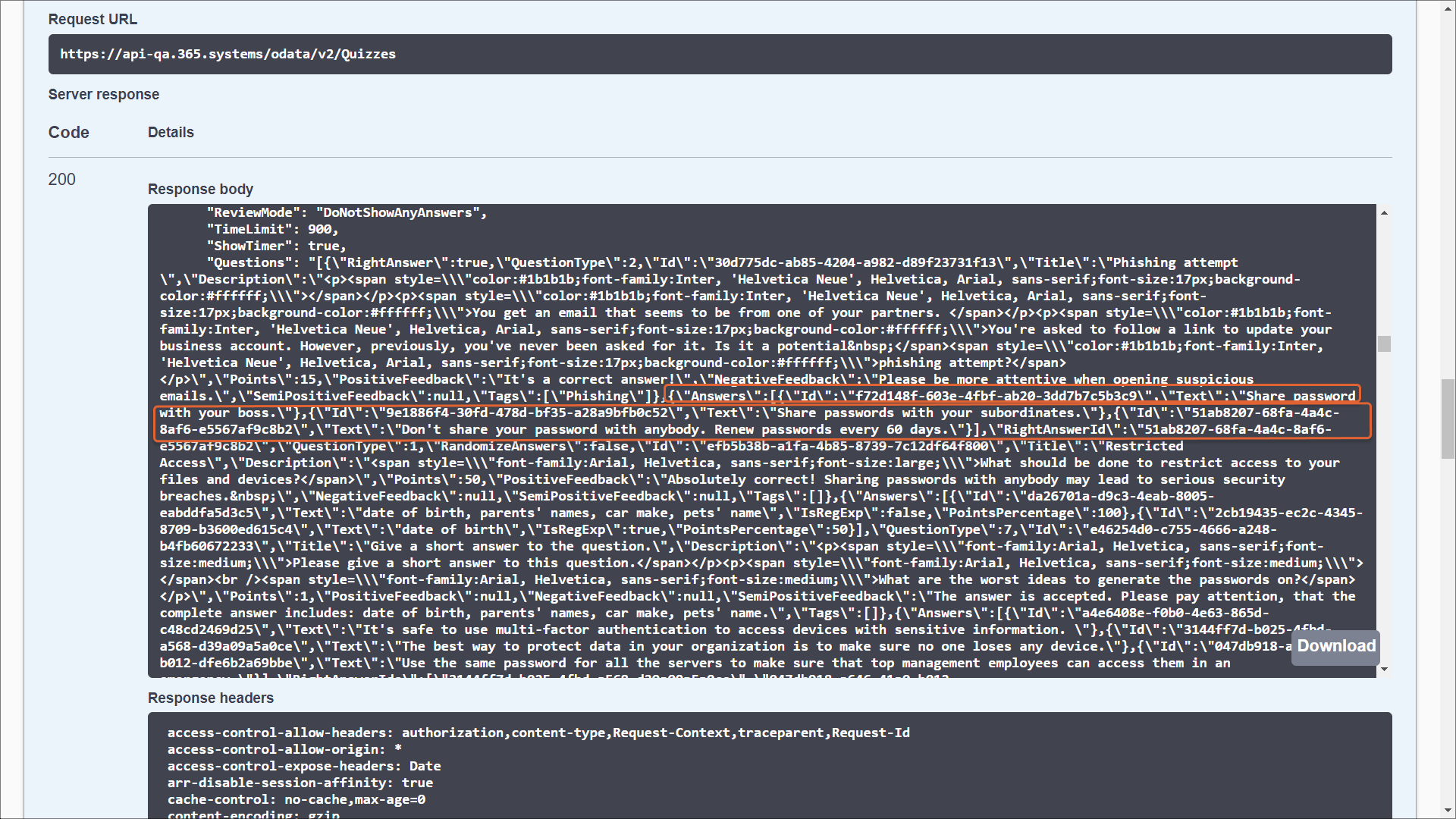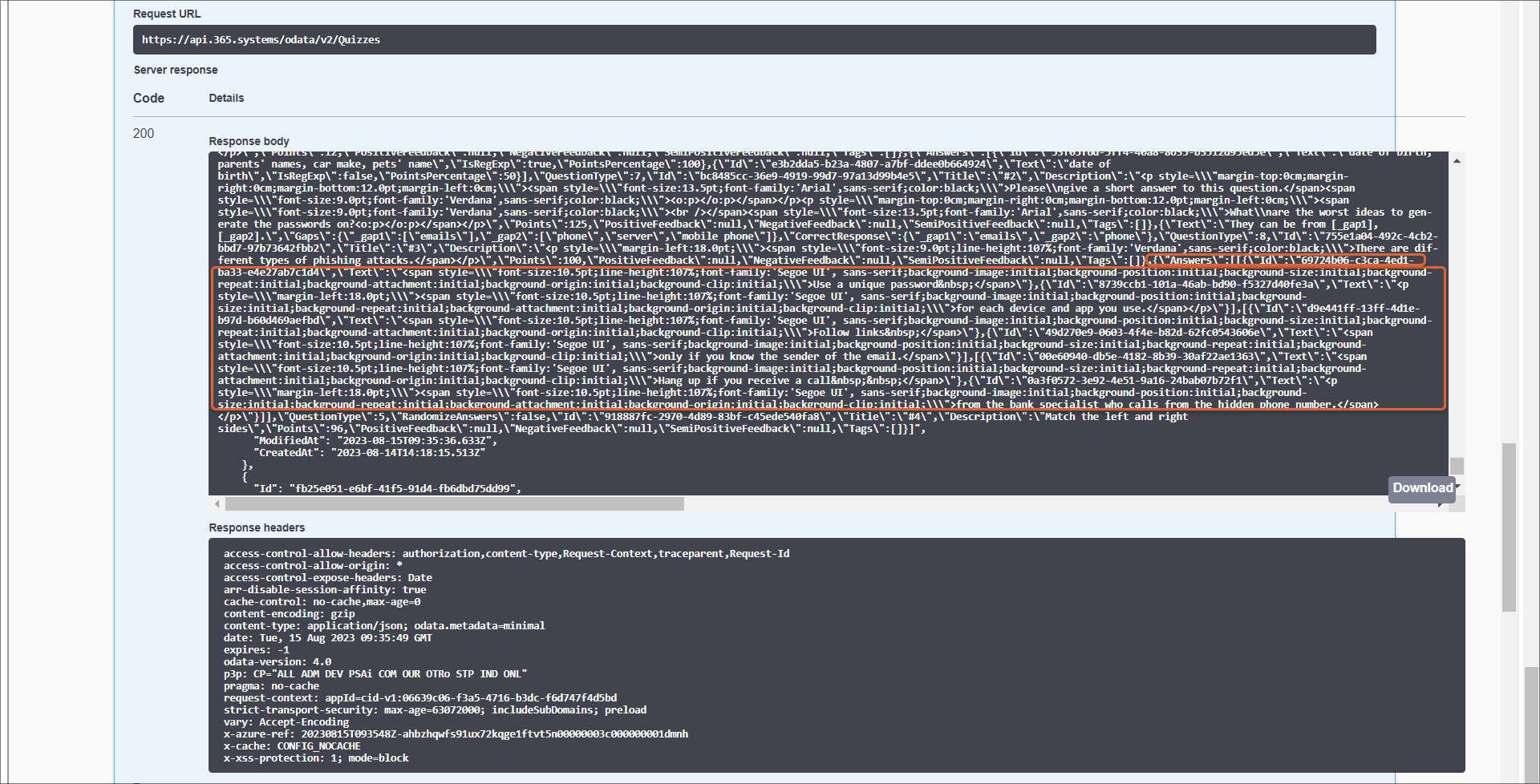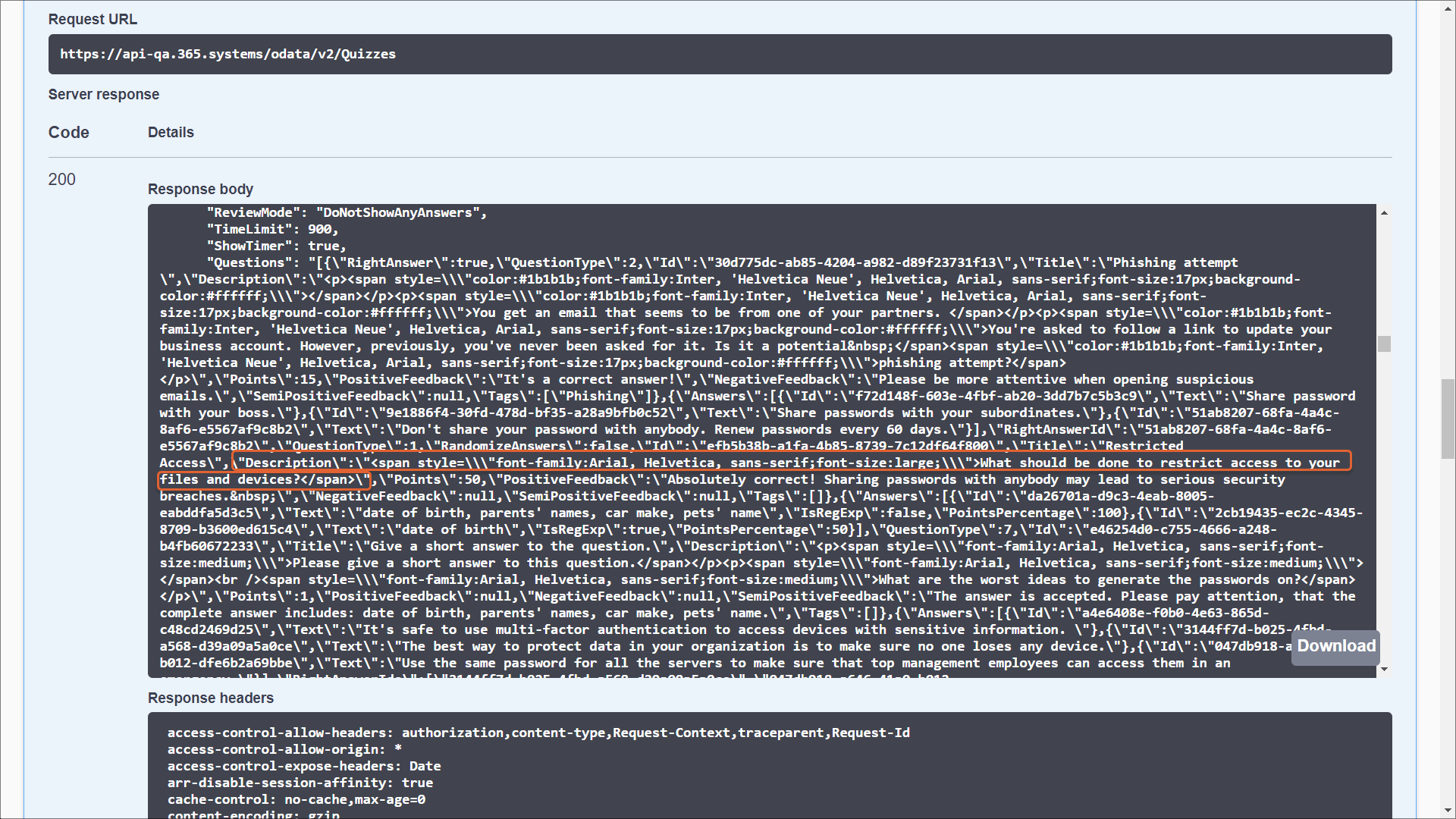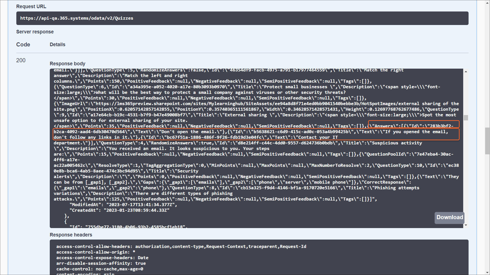 In this article, we'll show you how to read the Questions string in the Response body of GET requests made in the Quizzes section of the Learn365 API.
