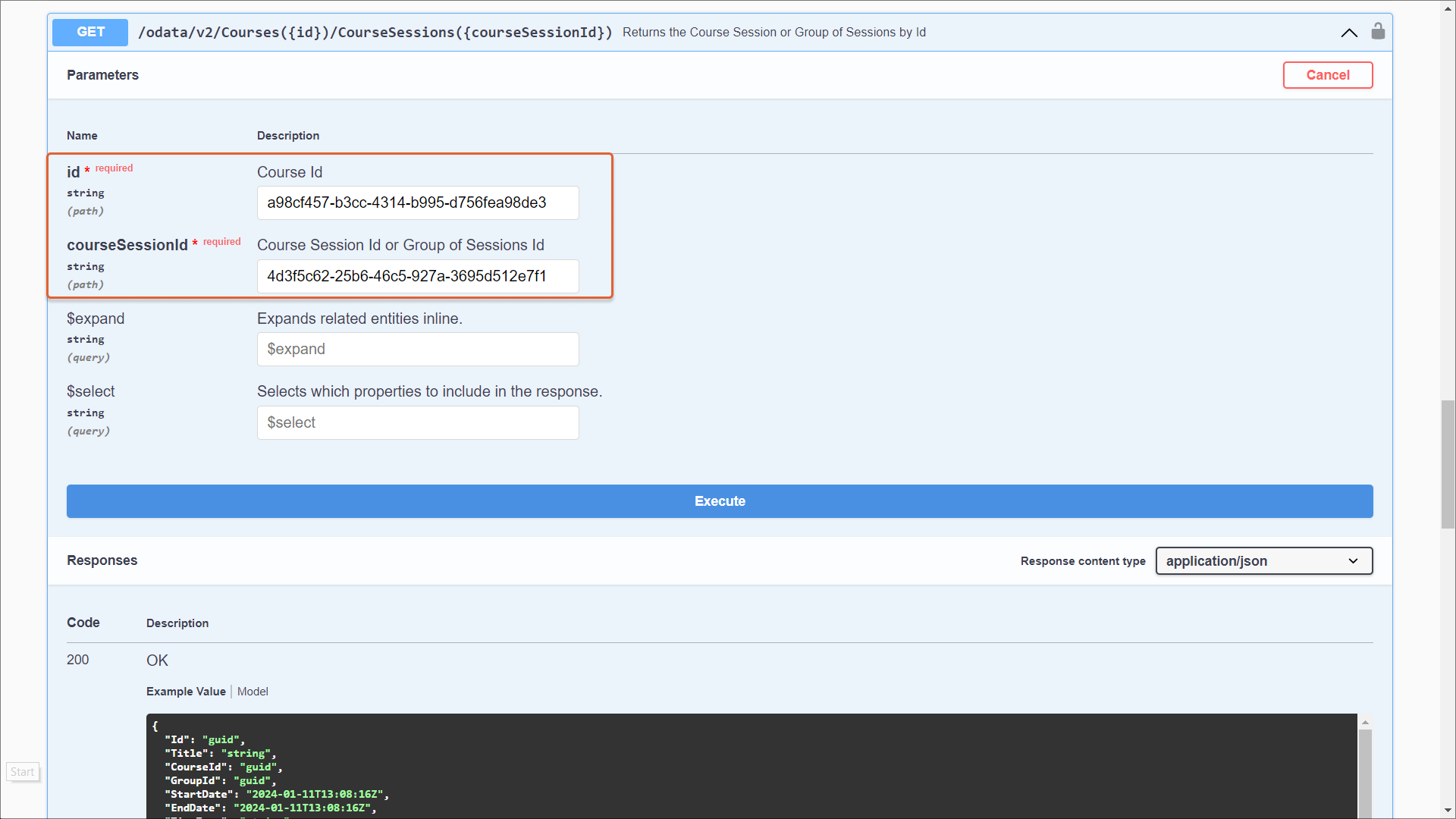 2. Select the GET/odata/v2/Courses({id})/CourseSessions({courseSessionId}) endpoint that returns data on a course session or group of sessions by the ID, and select Try it out.