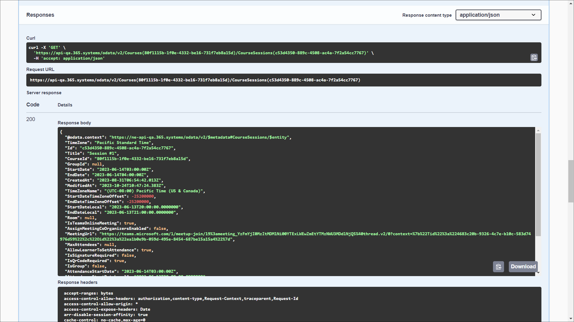 - In the Response body field, the returned data contains the course session details, including its name, start and end dates, time zone, instructors, etc.