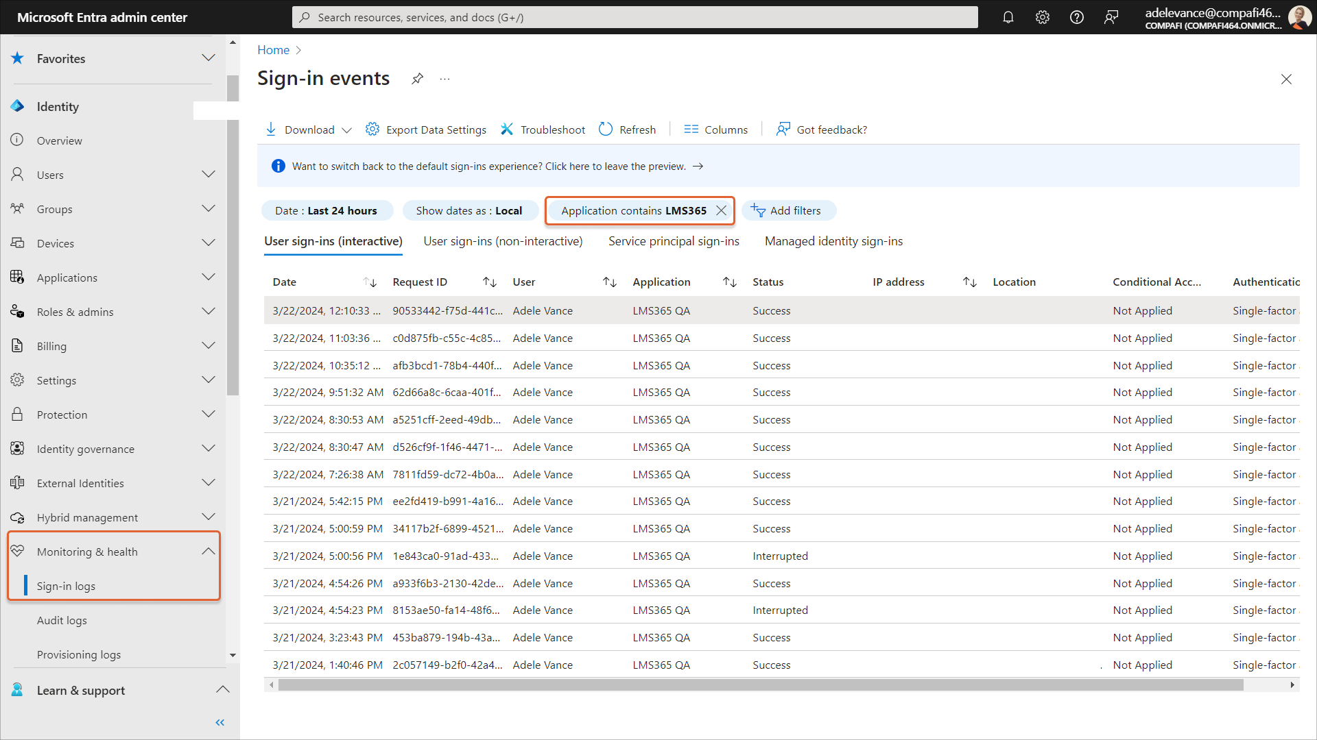1. In the Microsoft Entra admin center, go to Monitoring health > Sign-in logs.