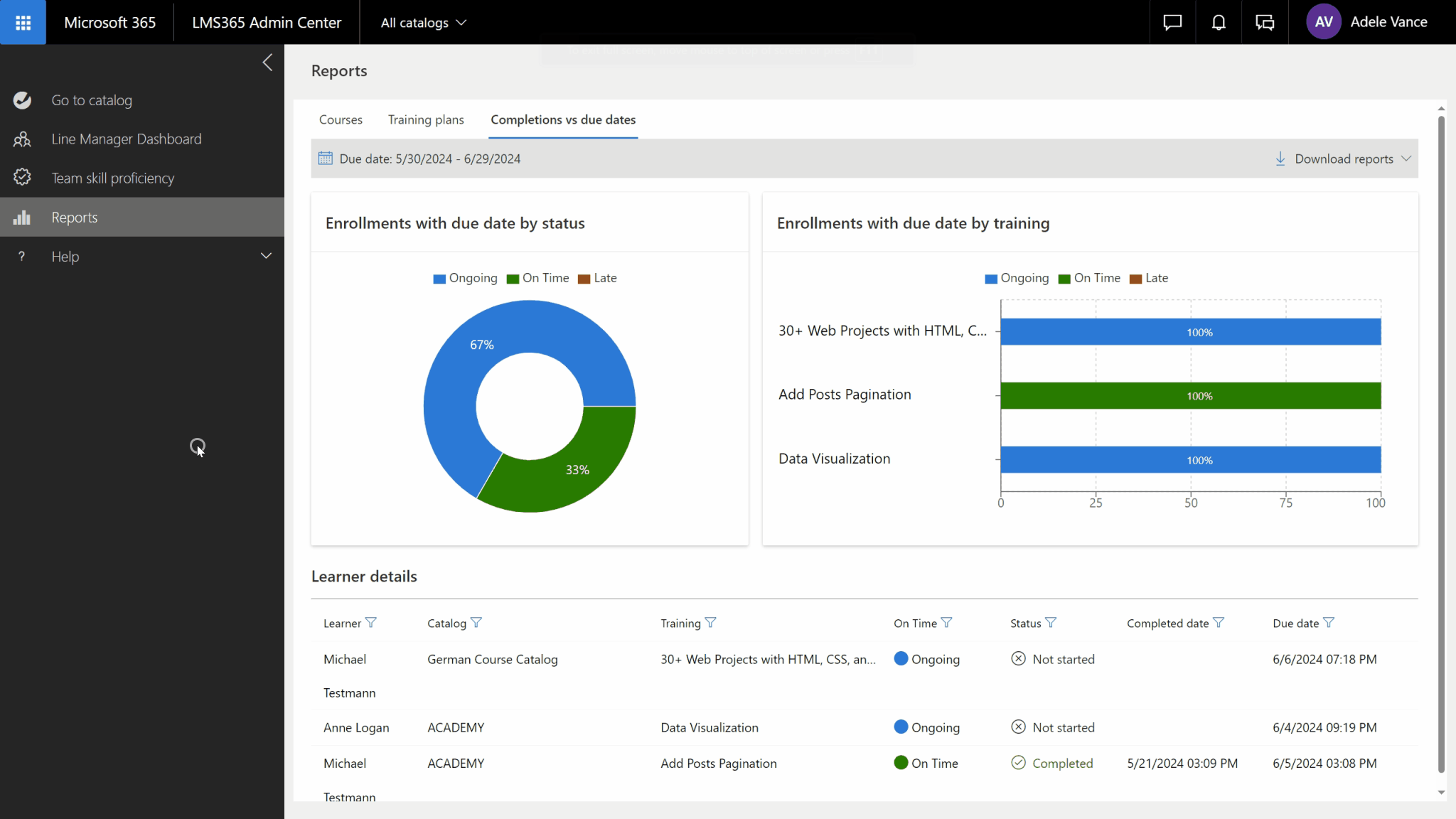 From this area, line managers can monitor the progress of all employees within their organizational scope of responsibility. The Courses, Training plans, and Completions vs due dates dashboards are available for line managers to view, while the Session attendance, Training progress, and Learner progress reports are available for download.