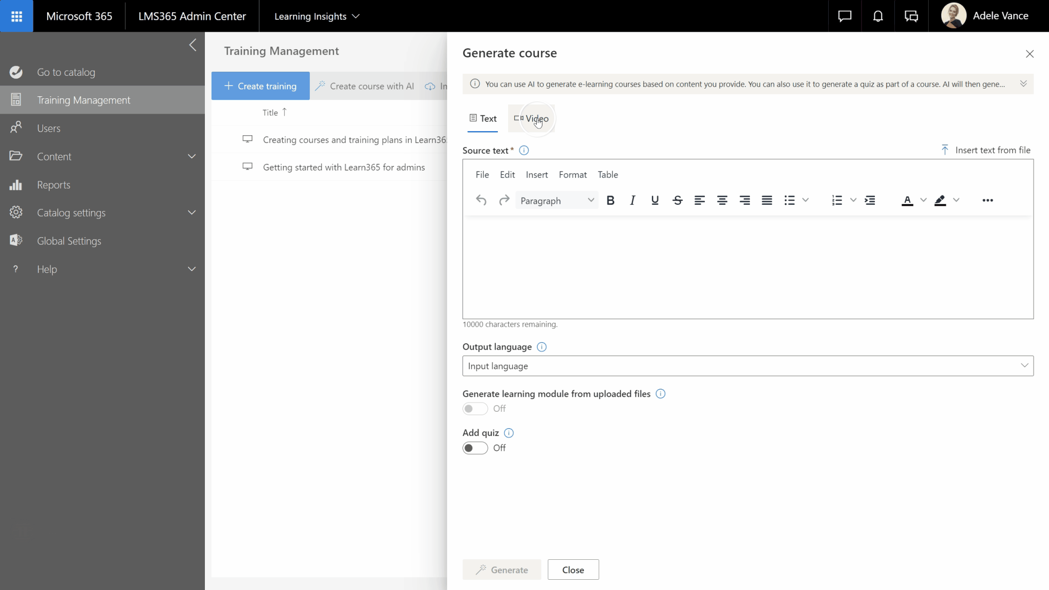 Also, admins can now control the output language, regardless of whether the course is created from a text, file, or video.