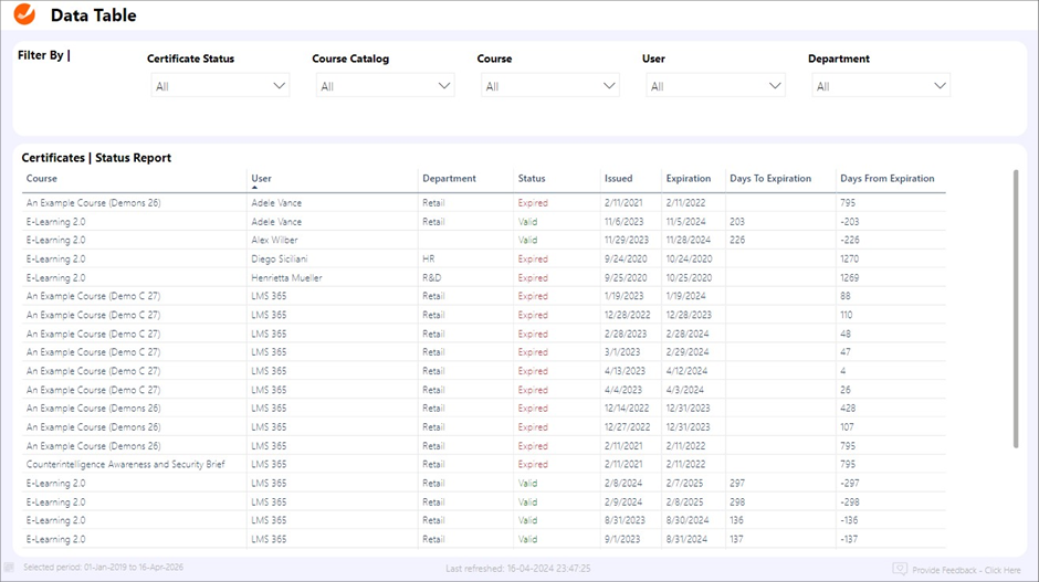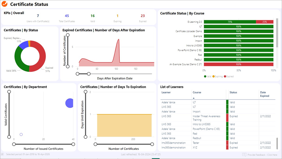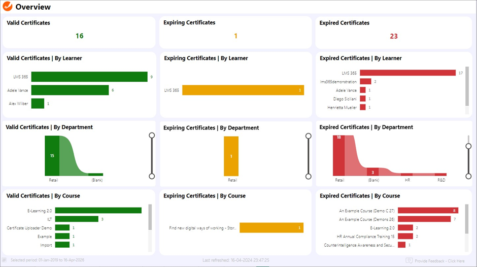 - By Course: Details which courses have the most valid, expiring, and expired certificates.