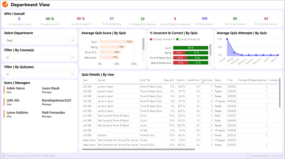 Review the KPIs to get a quick understanding of overall department performance. Explore the charts to discern patterns or areas needing attention. Analyze the "Quiz Details | By User" table to evaluate individual performances and their impact on the overall department metrics.